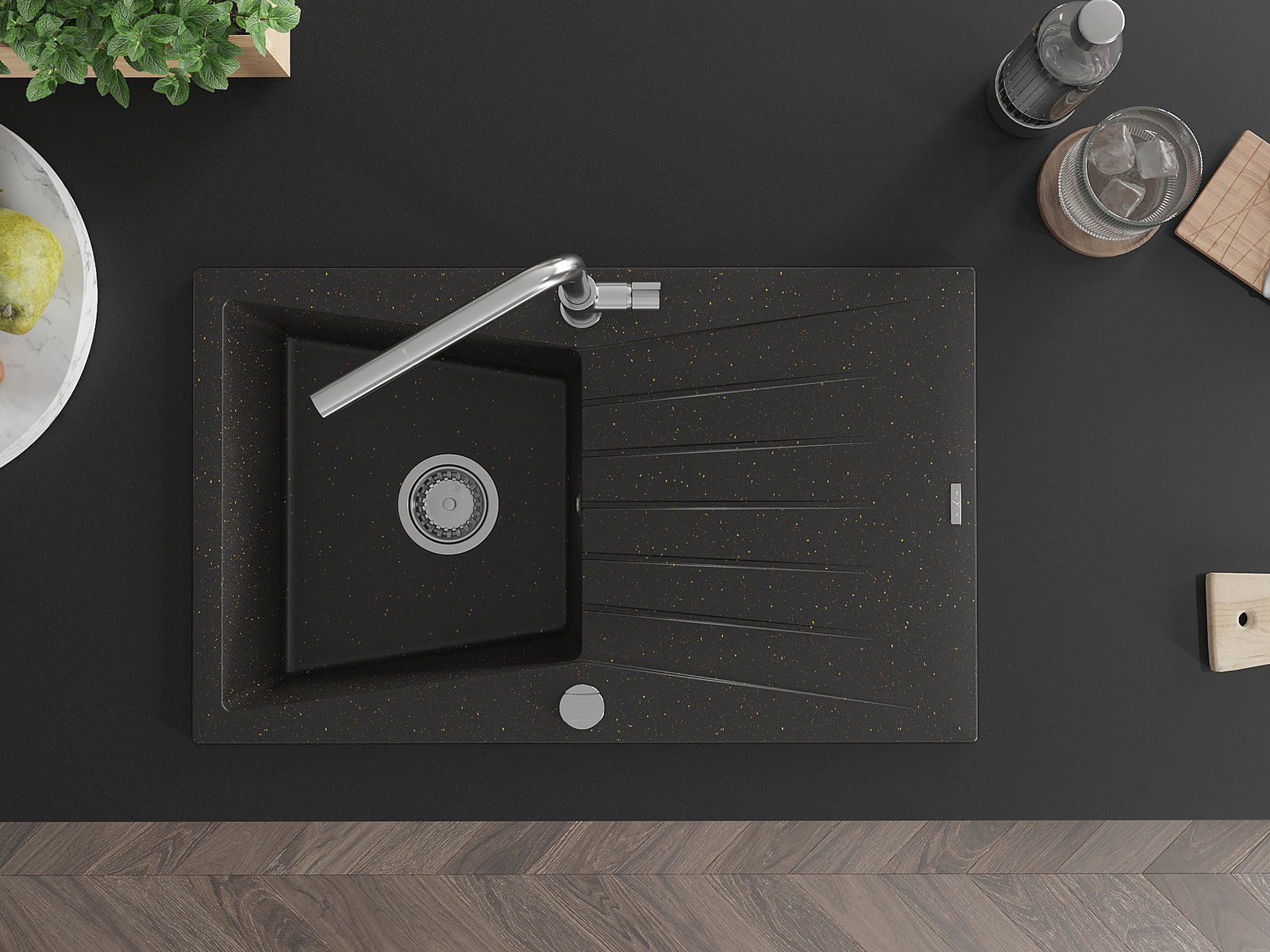 Mexen Cesar évier en granit 1 bac avec égouttoir et robinet de cuisine Flora, noir/doré métallique - 6514-75-670401-00