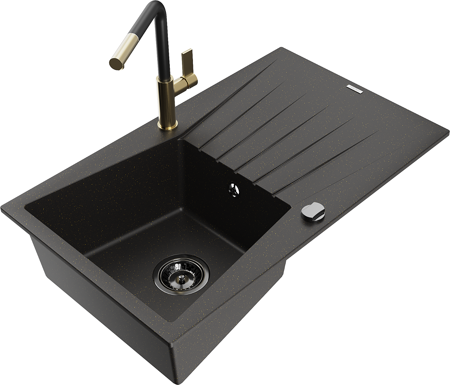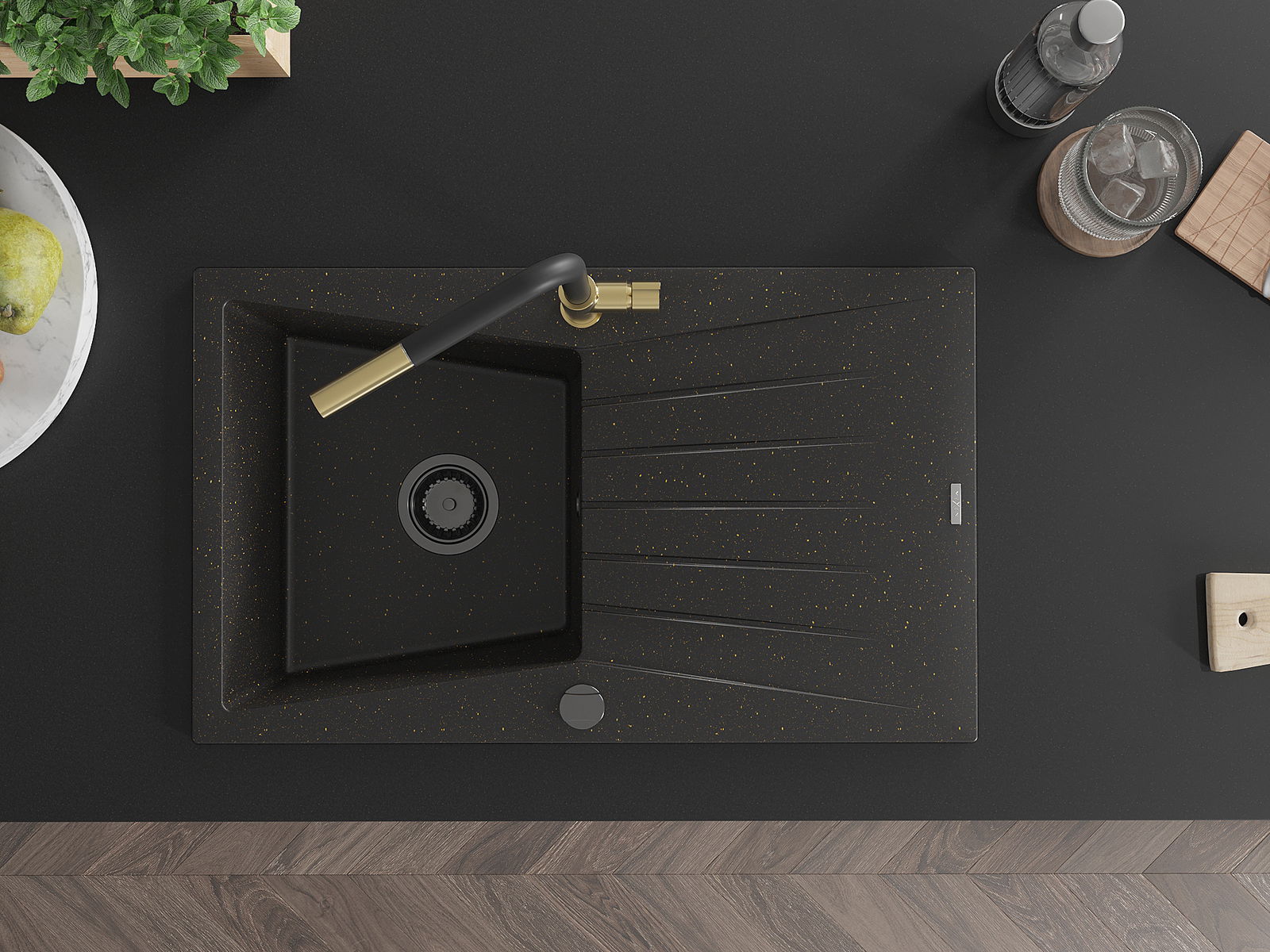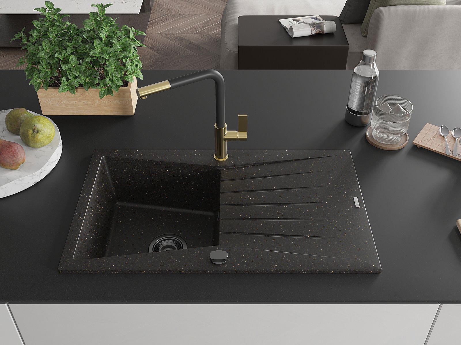 Mexen Cesar évier en granit 1 bac avec égouttoir et robinet de cuisine Flora, noir/doré métallique - 6514-75-670401-57-B