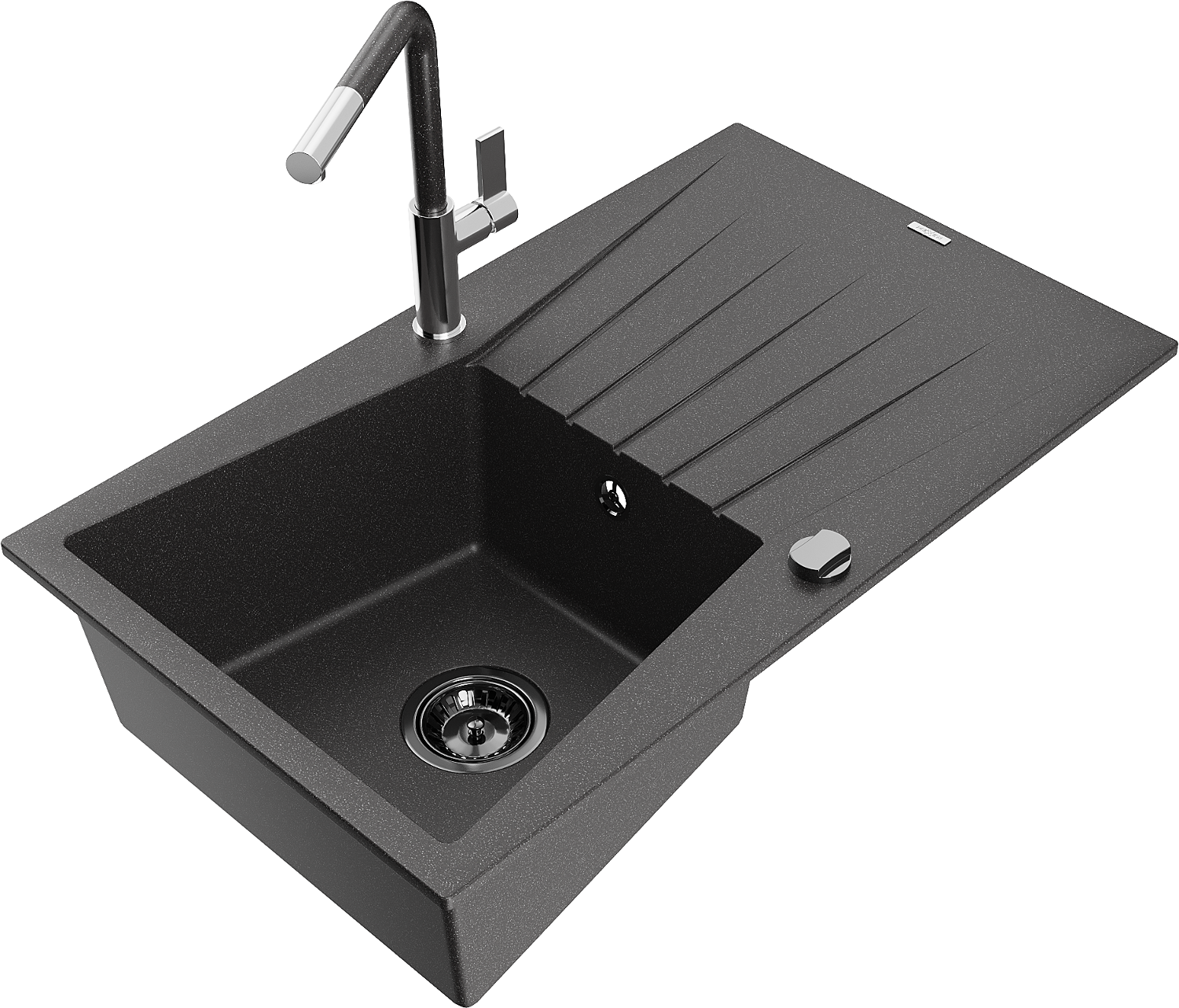 Mexen Cesar évier de cuisine en granit 1 bac avec égouttoir et robinet cuisine Flora, noir moucheté - 6514-76-670401-08-B
