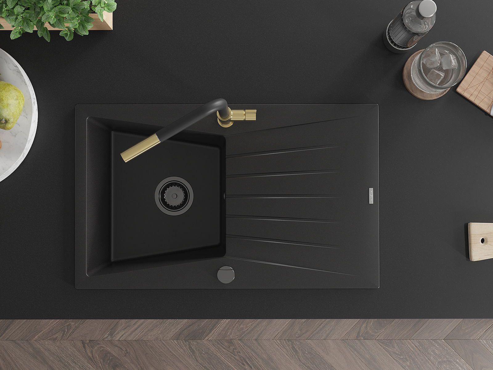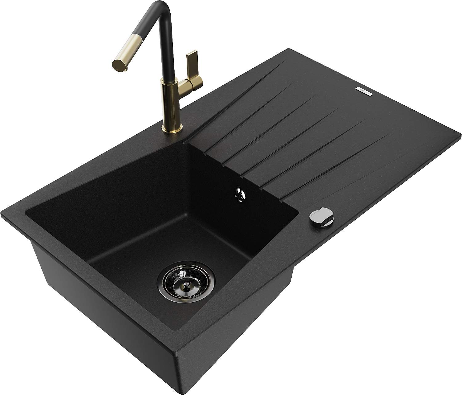 Mexen Cesar évier en granit à 1 bac avec égouttoir et robinet de cuisine Flora, noir - 6514-77-670401-57-B