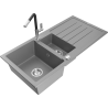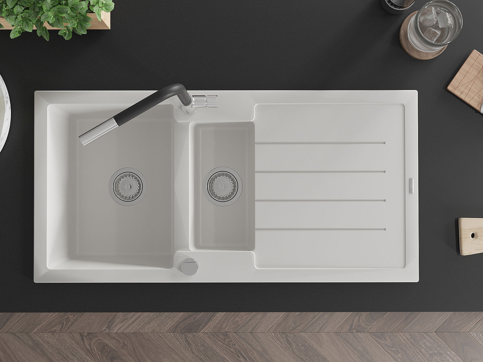 Mexen Andres évier en granit 1,5-bac avec égouttoir et robinet de cuisine Flora, blanc - 6515-20-670401-07