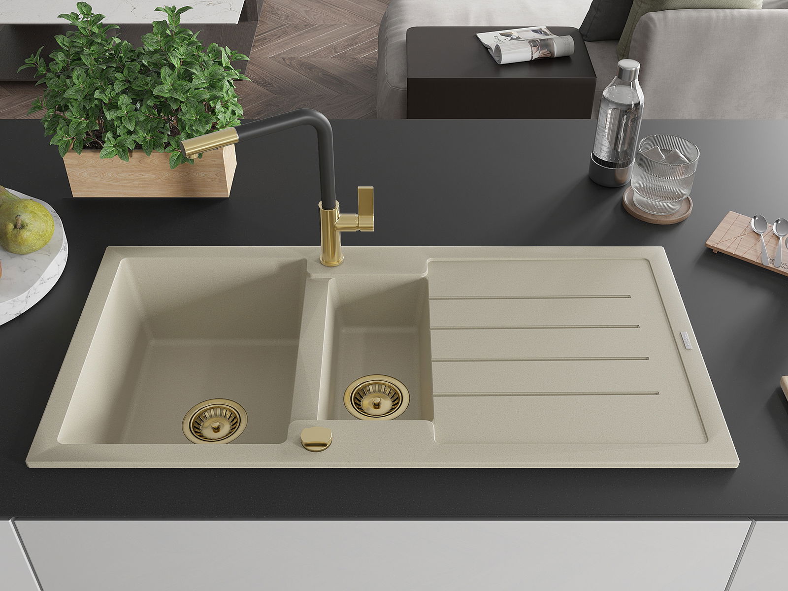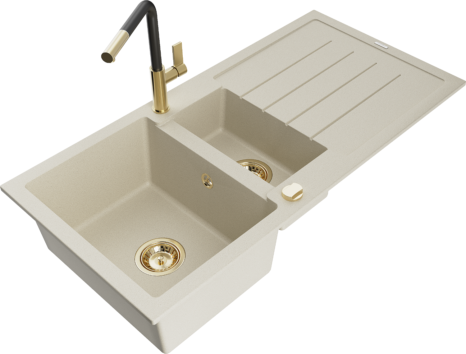 Mexen Andres évier en granit 1,5 bac avec égouttoir et robinet de cuisine Flora, beige - 6515-69-670401-57-G