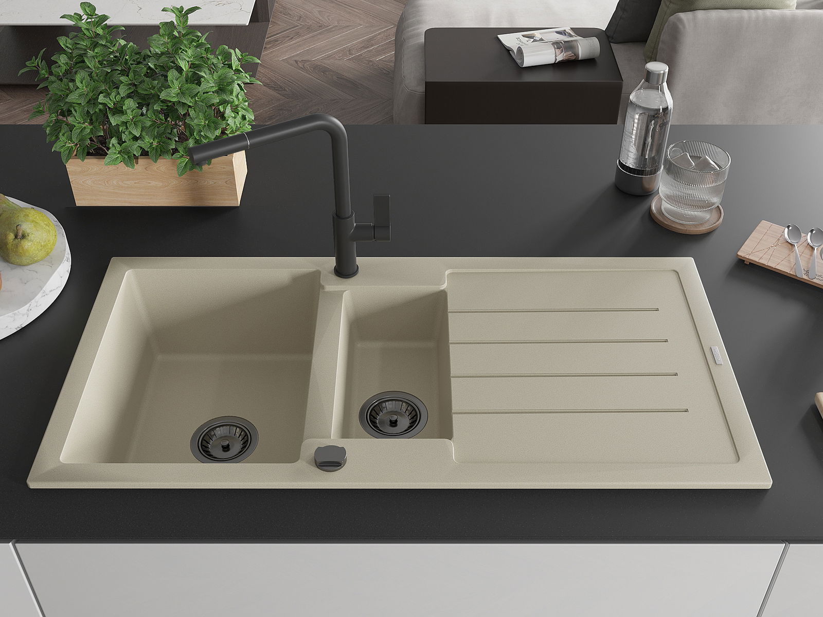 Mexen Andres évier en granit 1,5-bac avec égouttoir et robinet de cuisine Flora, beige - 6515-69-670401-70-B