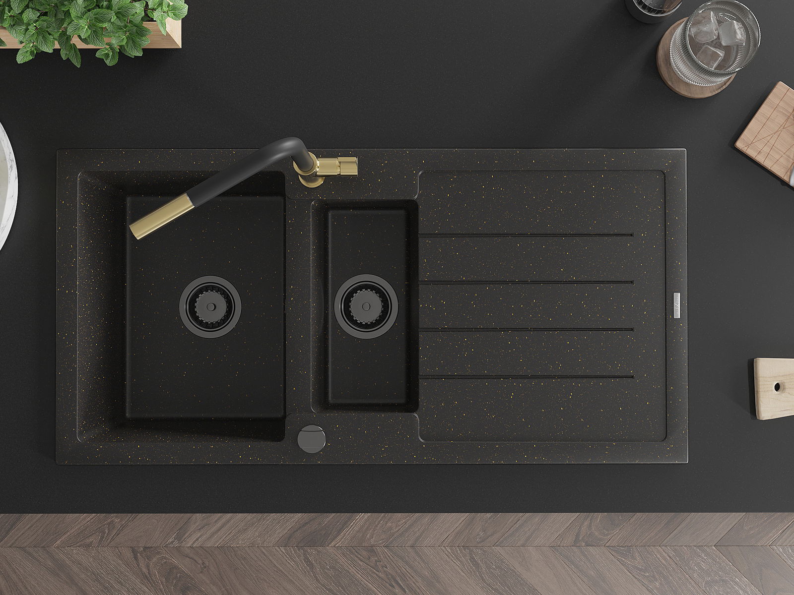 Mexen Andres évier en granit 1,5 bac avec égouttoir et robinet de cuisine Flora, noir/or - 6515-75-670401-57-B