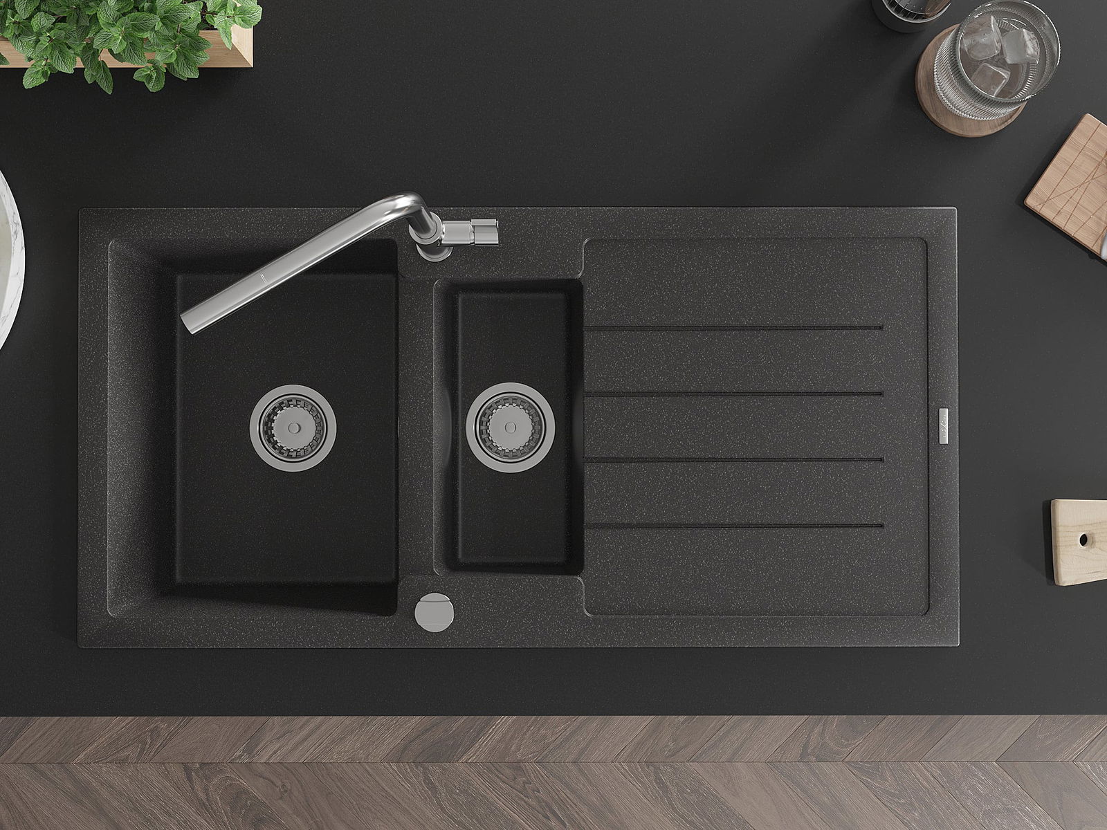 Mexen Andres évier en granit 1,5 bac avec égouttoir et robinet de cuisine Flora, noir moucheté - 6515-76-670401-00