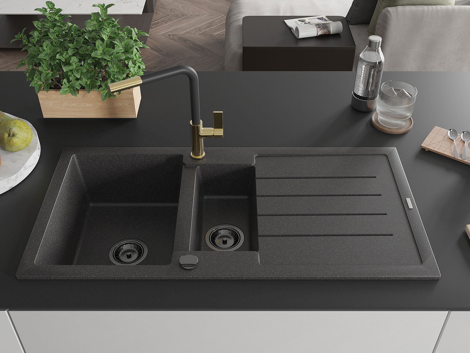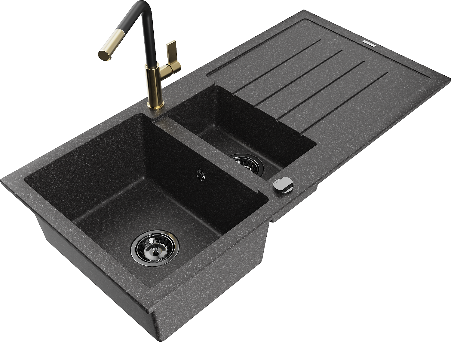 Mexen Andres évier en granit 1,5 bac avec égouttoir et robinet de cuisine Flora, noir moucheté - 6515-76-670401-57-B