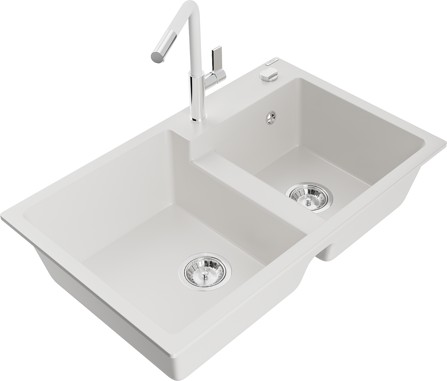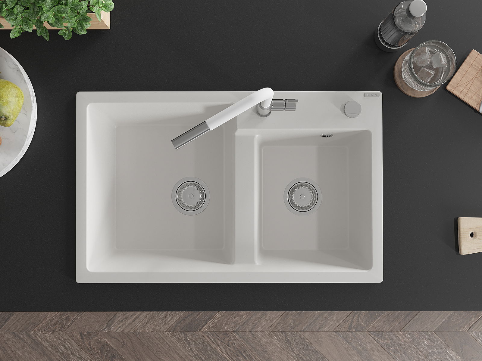 Mexen Tomas évier en granit à 2 bacs avec robinet de cuisine Flora, blanc - 6516-20-670401-02