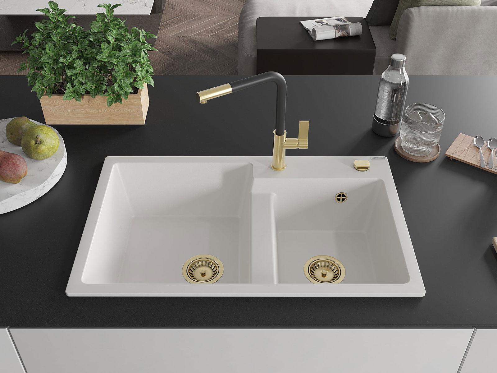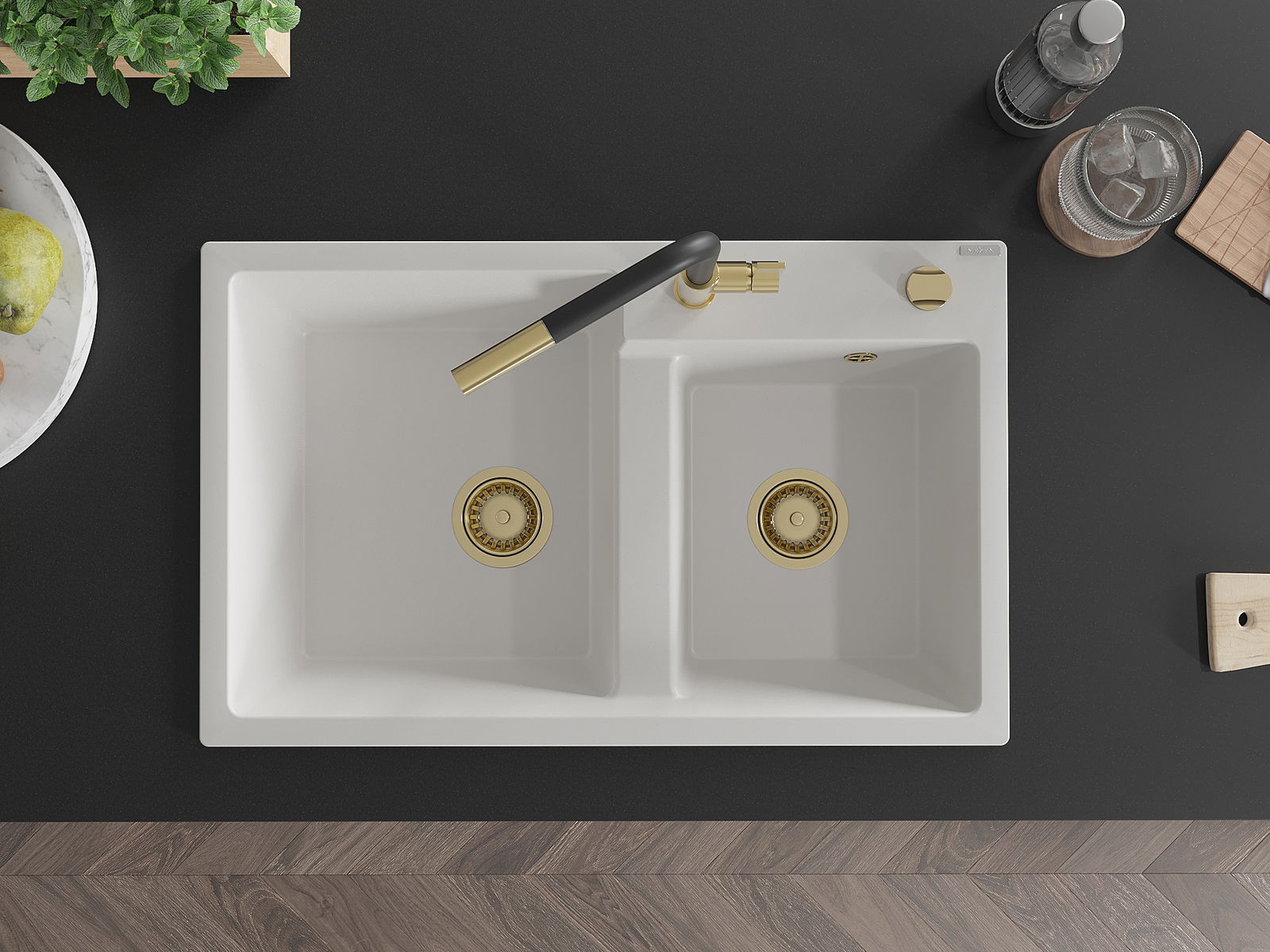 L'évier a un trou sous-meulé de 35 mm de diamètre à percer soi-même. Il peut être utilisé, entre autres, pour installer un distributeur de liquide, ce qui éliminera la présence de bouteilles en plastique dans la cuisine et lui donnera une finition élégante.