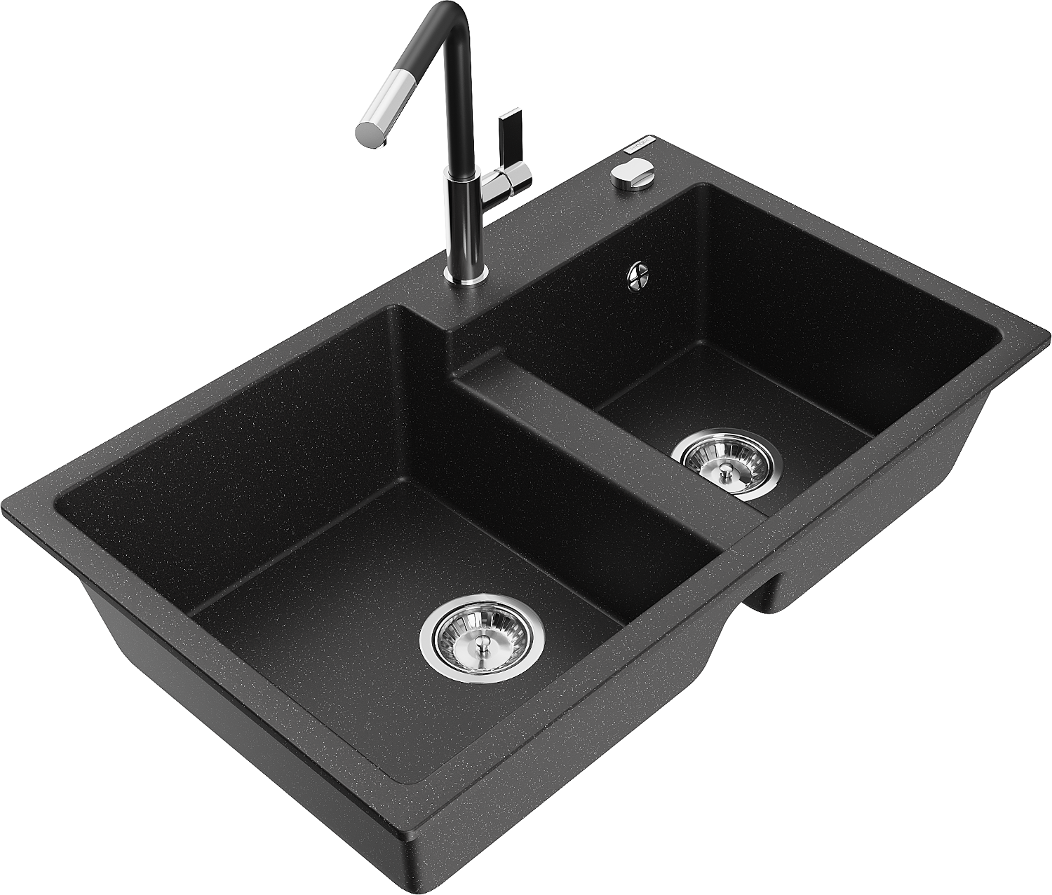 Mexen Tomas évier de cuisine en granit à 2 bacs avec robinet de cuisine Flora, noir/métallisé argent - 6516-73-670401-07
