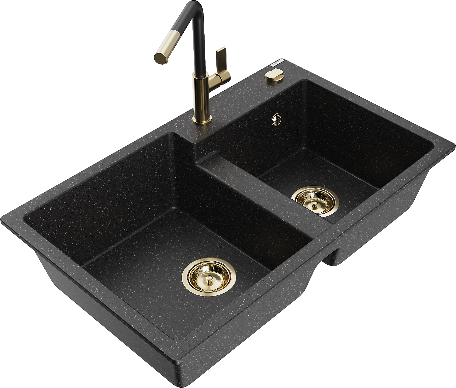 Mexen Tomas évier en granit 2 cuves avec robinet de cuisine Flora, noir/argent métallisé - 6516-73-670401-57-G
