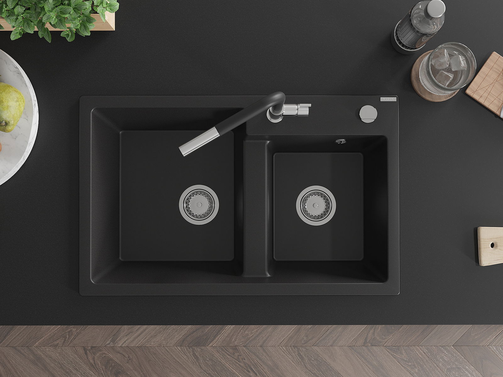 Mexen Tomas évier de cuisine en granit à 2 bacs avec robinet de cuisine Flora, noir - 6516-77-670401-07