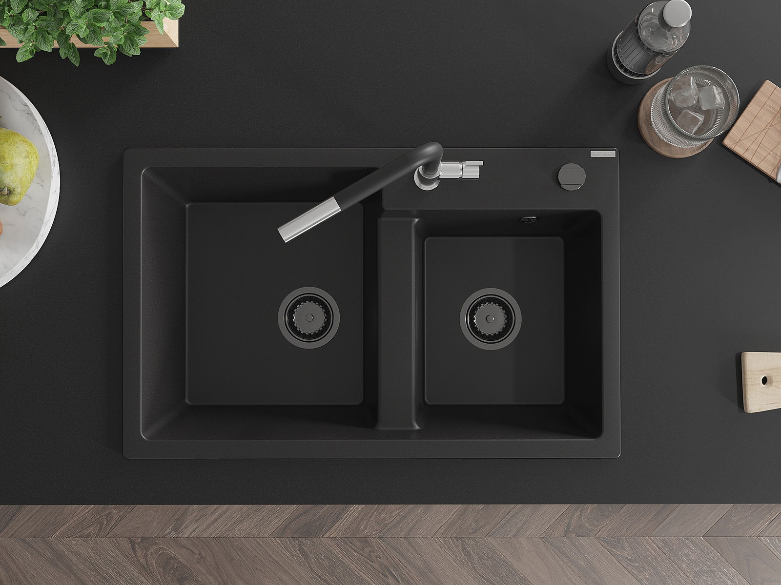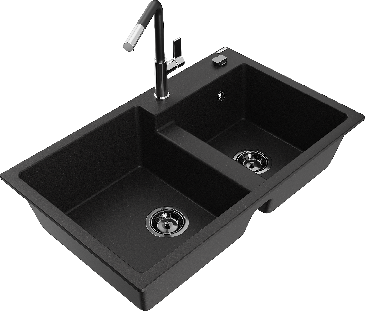 Mexen Tomas évier en granit à 2 bacs avec robinet de cuisine Flora, noir - 6516-77-670401-07-B