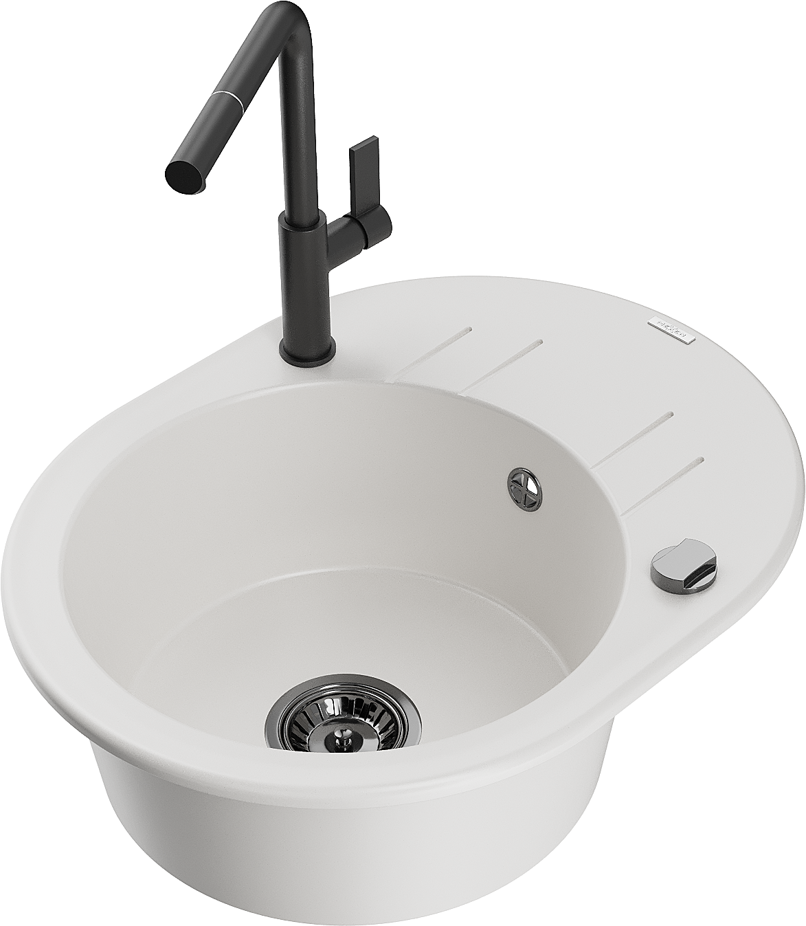 Mexen Kevin évier en granit à 1 bac avec égouttoir et robinet de cuisine Flora, blanc - 6517-20-670401-70-B