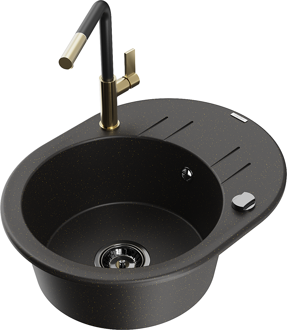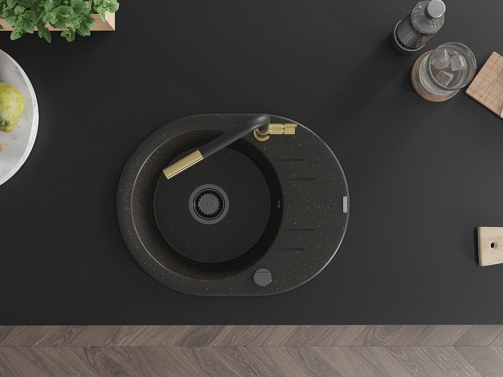 Mexen Kevin évier en granit 1 bac avec égouttoir et robinet de cuisine Flora, noir/métallisé doré - 6517-75-670401-57-B