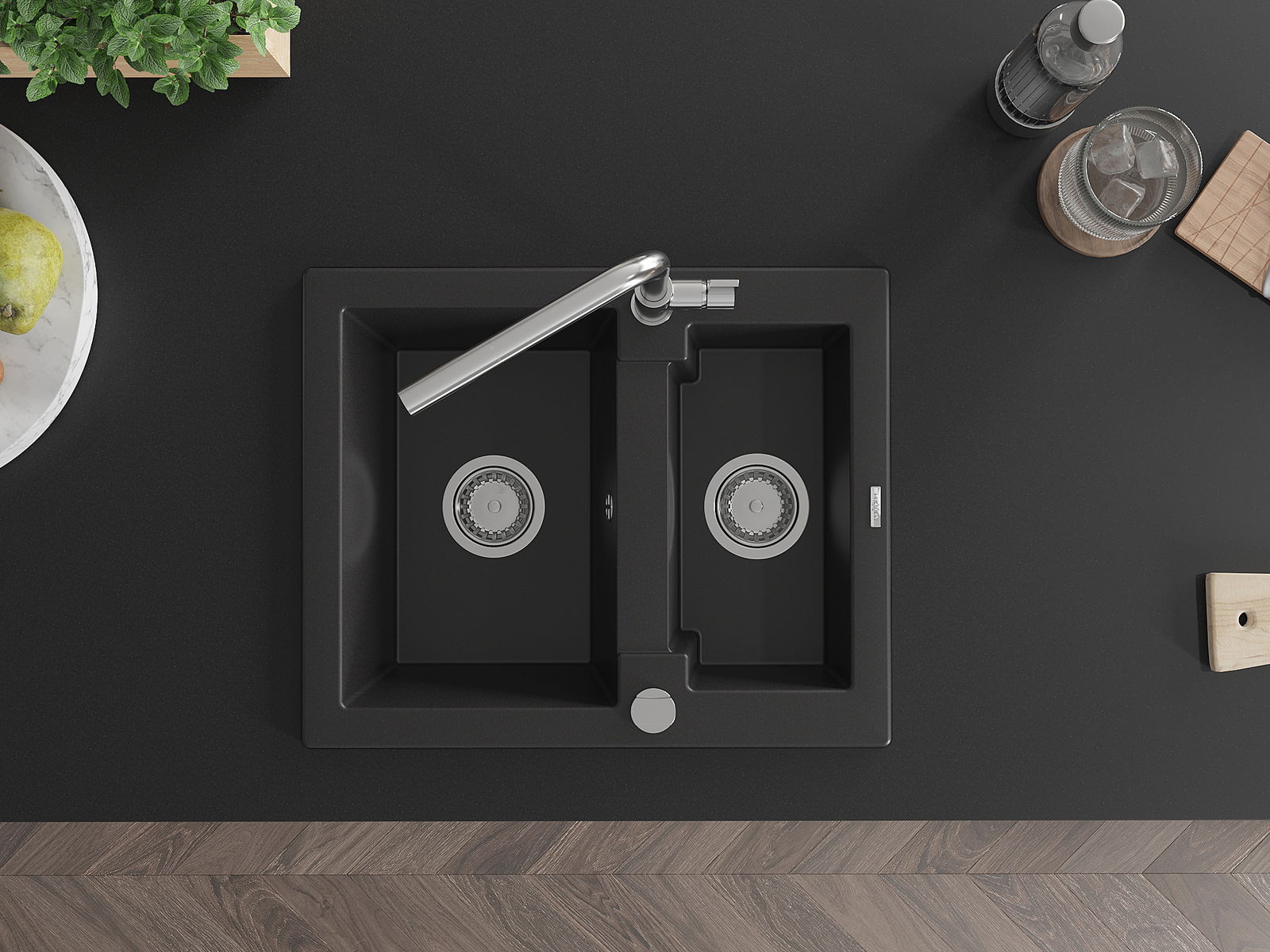 Mexen Carlos évier en granit 1,5 bac avec robinet de cuisine Flora, noir - 6518-77-670401-00