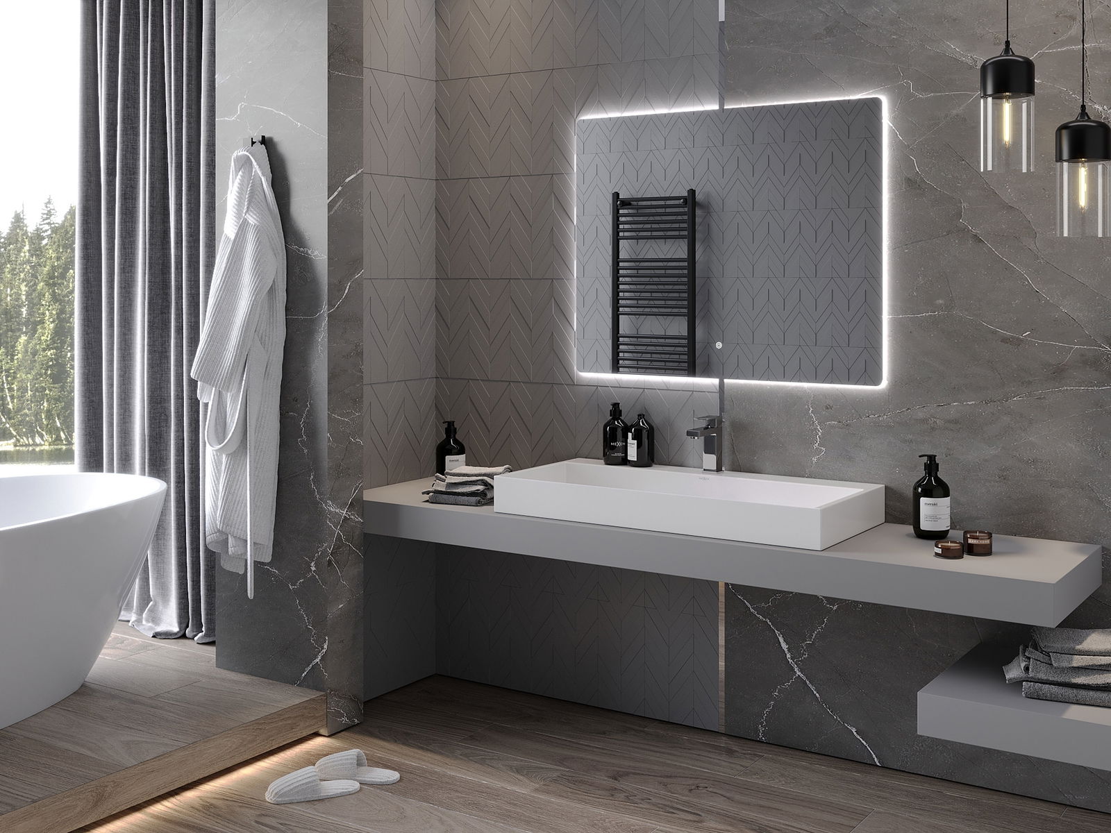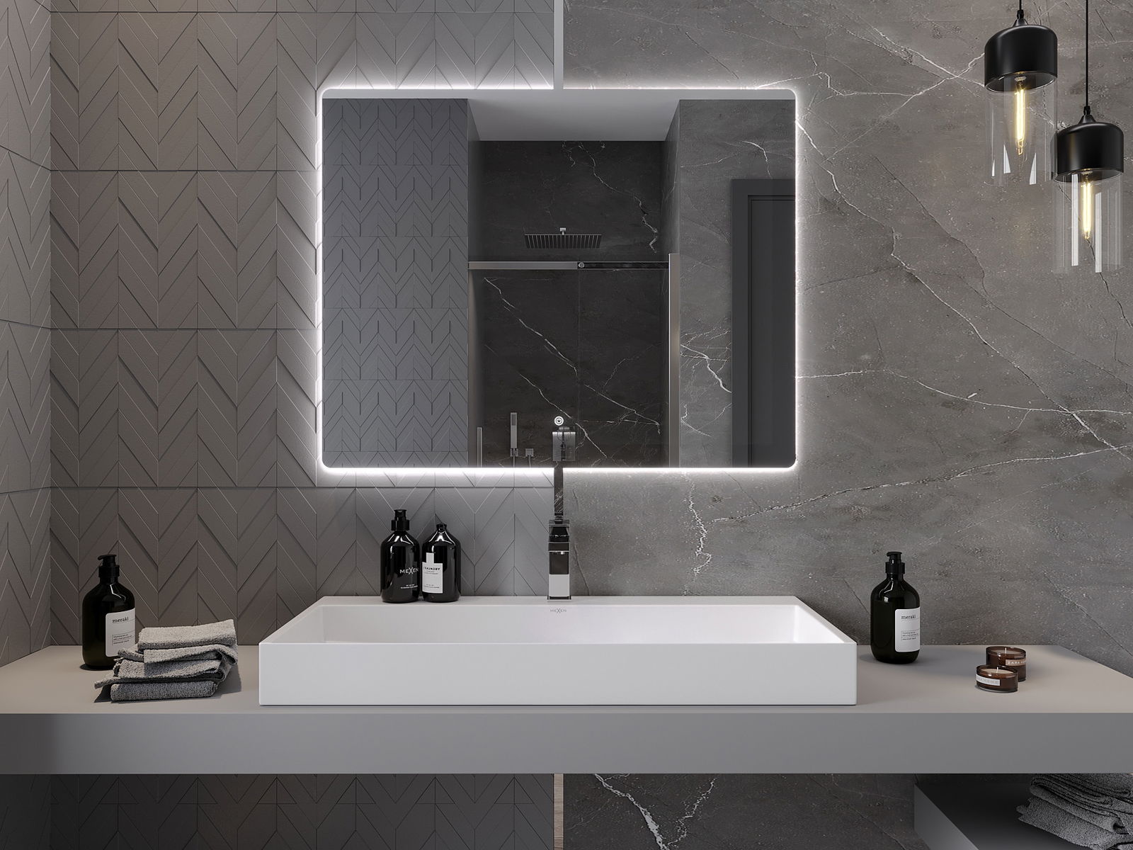 L'éclairage LED autour du miroir est un élément pratique qui facilite les soins quotidiens en offrant la possibilité d'éclairer parfaitement le visage. L'éclairage donne à la salle de bain une finition moderne, soulignant son décor élégant.