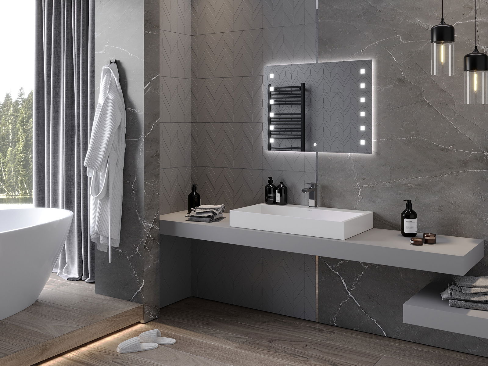 L'éclairage LED autour du miroir est un élément pratique qui facilite les soins quotidiens en offrant la possibilité d'éclairer parfaitement le visage. L'éclairage donne à la salle de bain une finition moderne, soulignant son décor élégant.