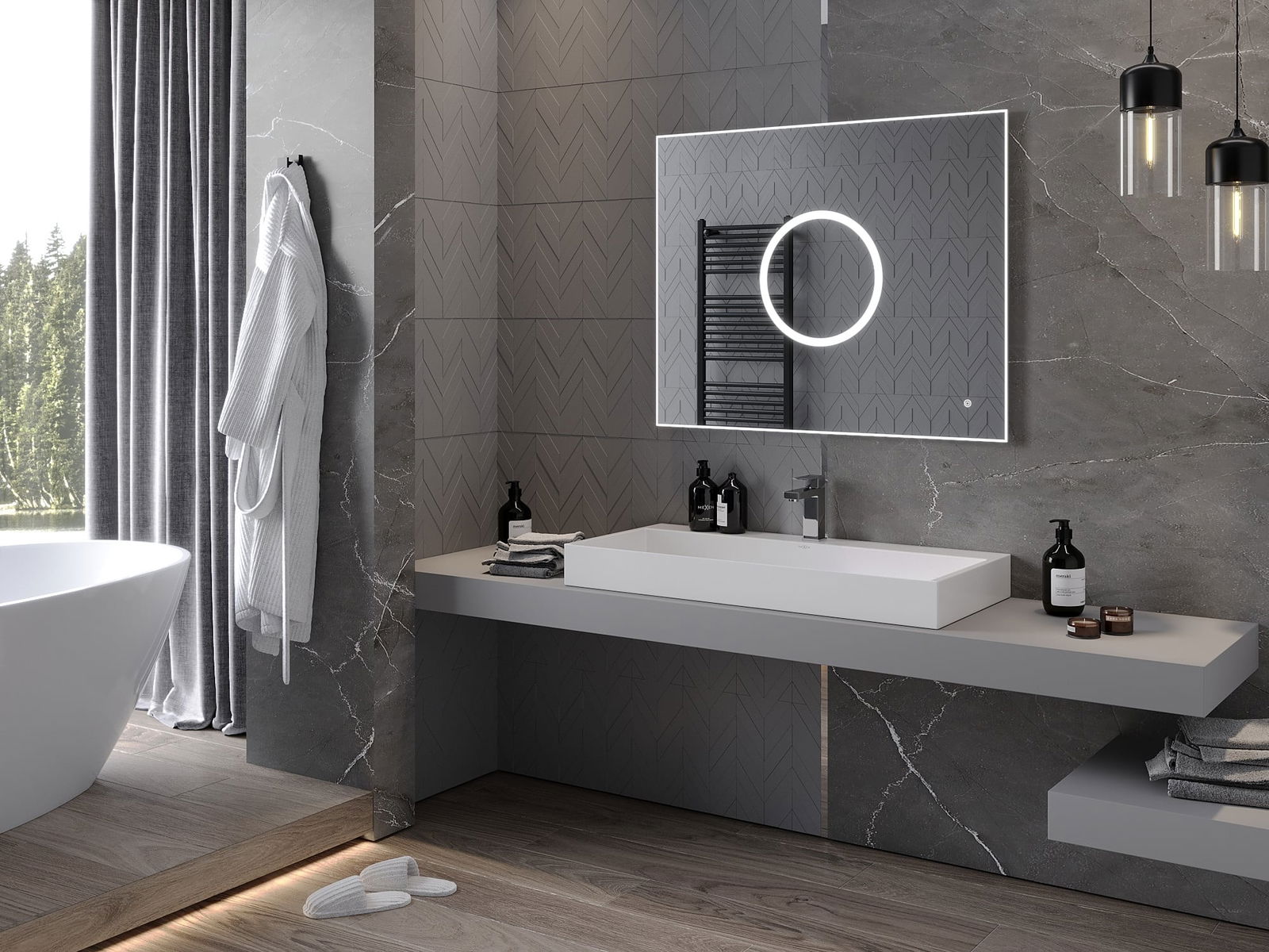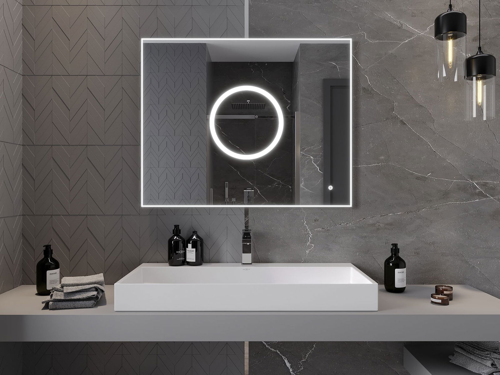 L'éclairage LED autour du miroir est un élément pratique qui facilite les soins quotidiens en offrant la possibilité d'éclairer parfaitement le visage. L'éclairage donne à la salle de bain une finition moderne, soulignant son décor élégant.