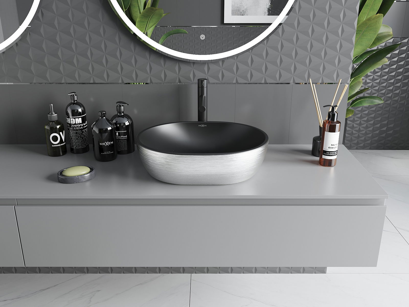 Mexen Viki lavabo à poser 48 x 35 cm, noir mat/motif argent lignes - 21054873