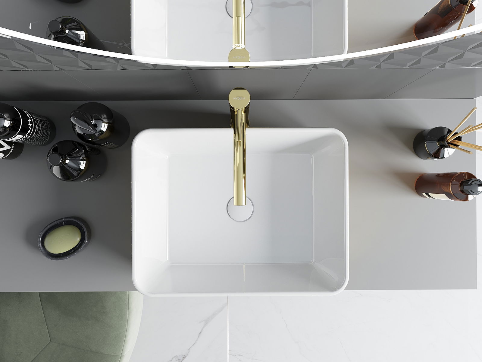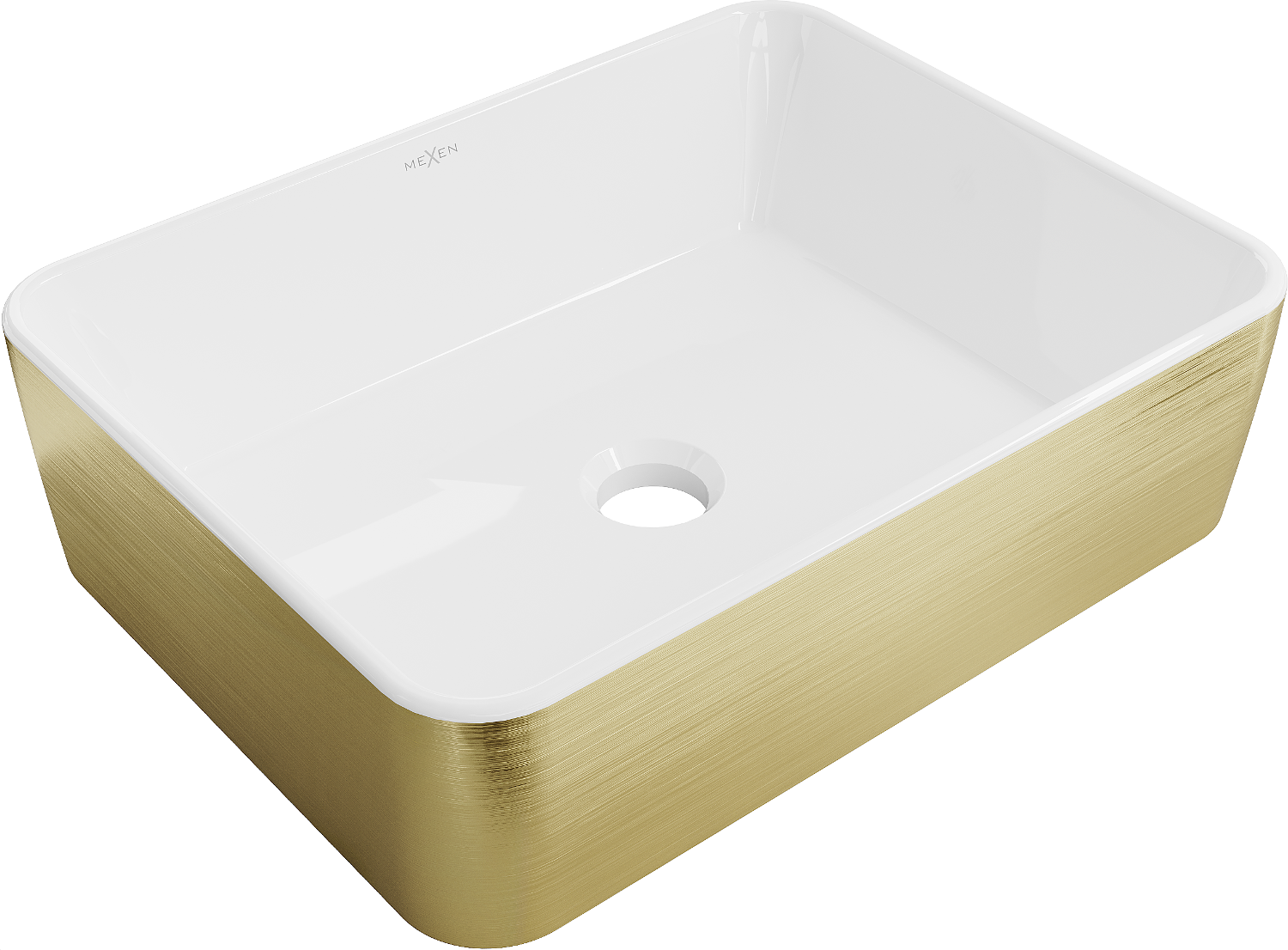 Mexen Catia est un élégant lavabo à poser de dimensions 48 x 38 cm en coloris blanc et doré, parfait pour les salles de bains modernes. Fabriqué en céramique sanitaire de haute qualité, il se distingue par sa forme rectangulaire et sa surface mate, ce qui lui confère un charme unique. L'absence de trous pour robinetterie et de trop-plein assure un design minimaliste, et un revêtement protecteur supplémentaire augmente sa durabilité. Idéal pour compléter un intérieur de style luxueux ou scandinave.
