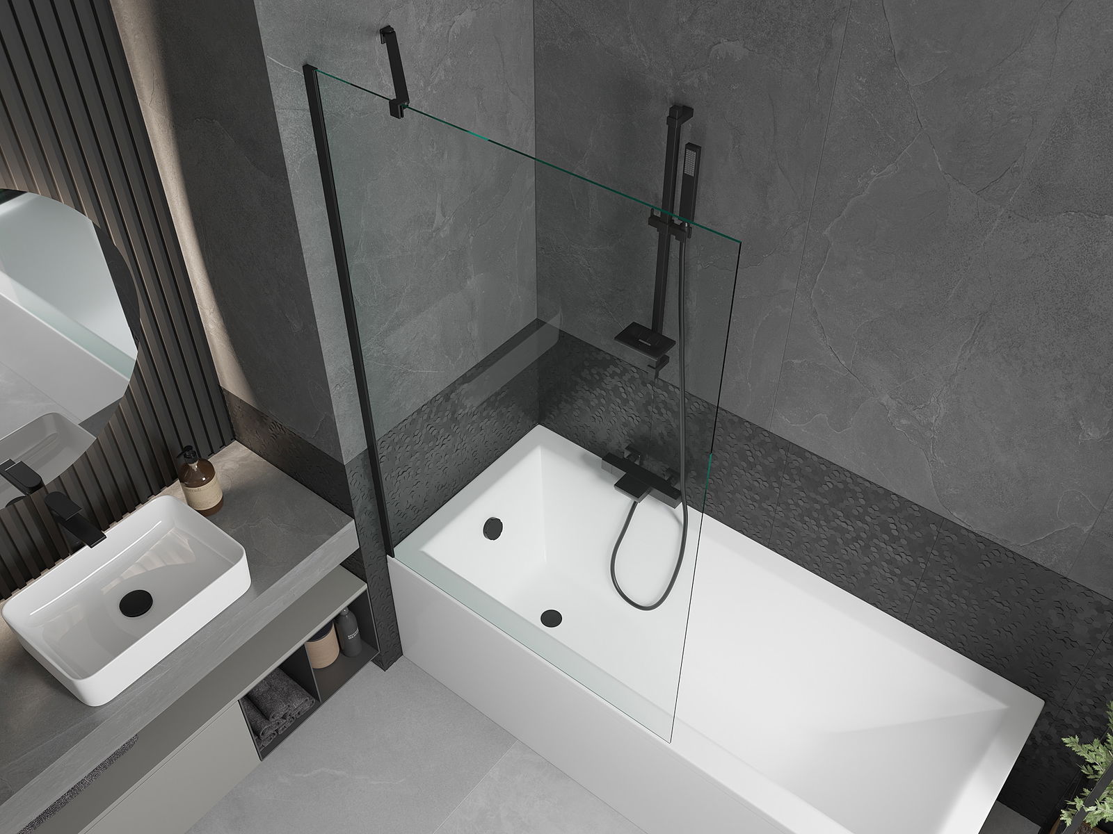 Mexen Cubik baignoire rectangulaire 160 x 70 cm avec tablier et écran 1 volet 100 cm, transparent, noir - 550316070X9510000070