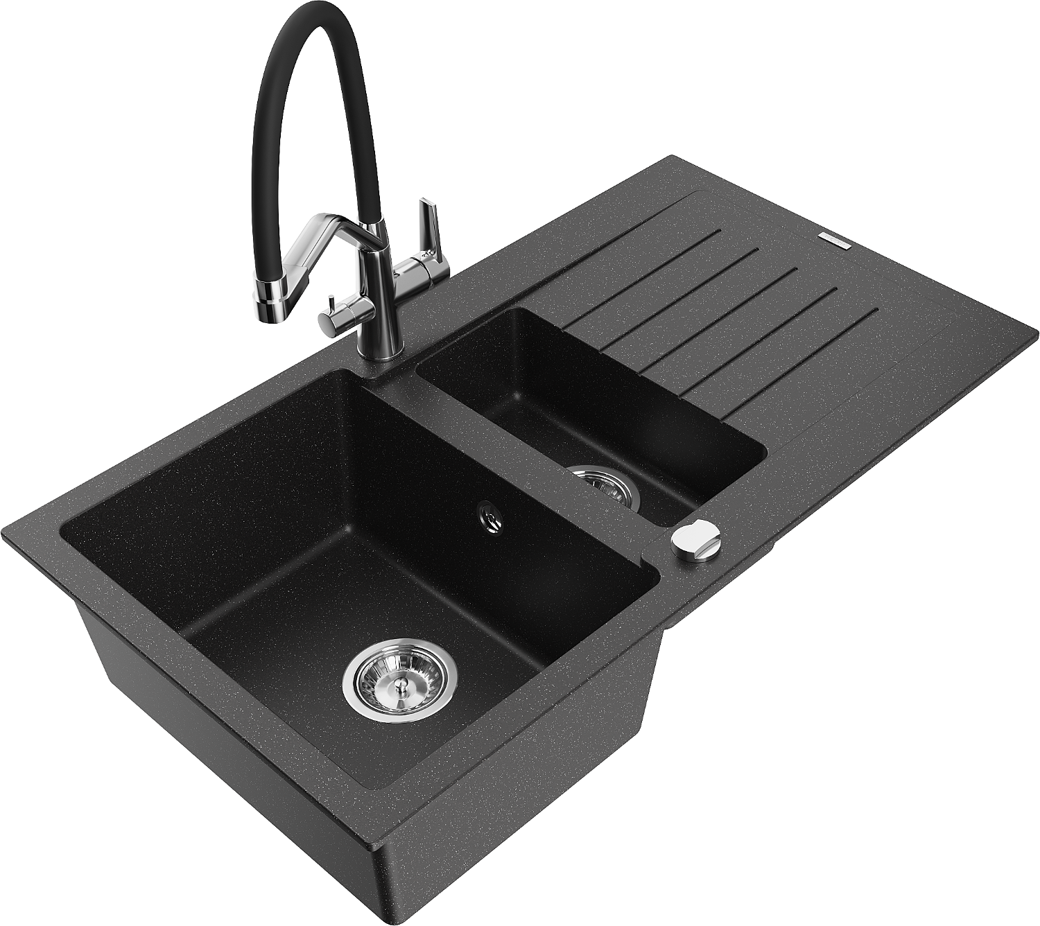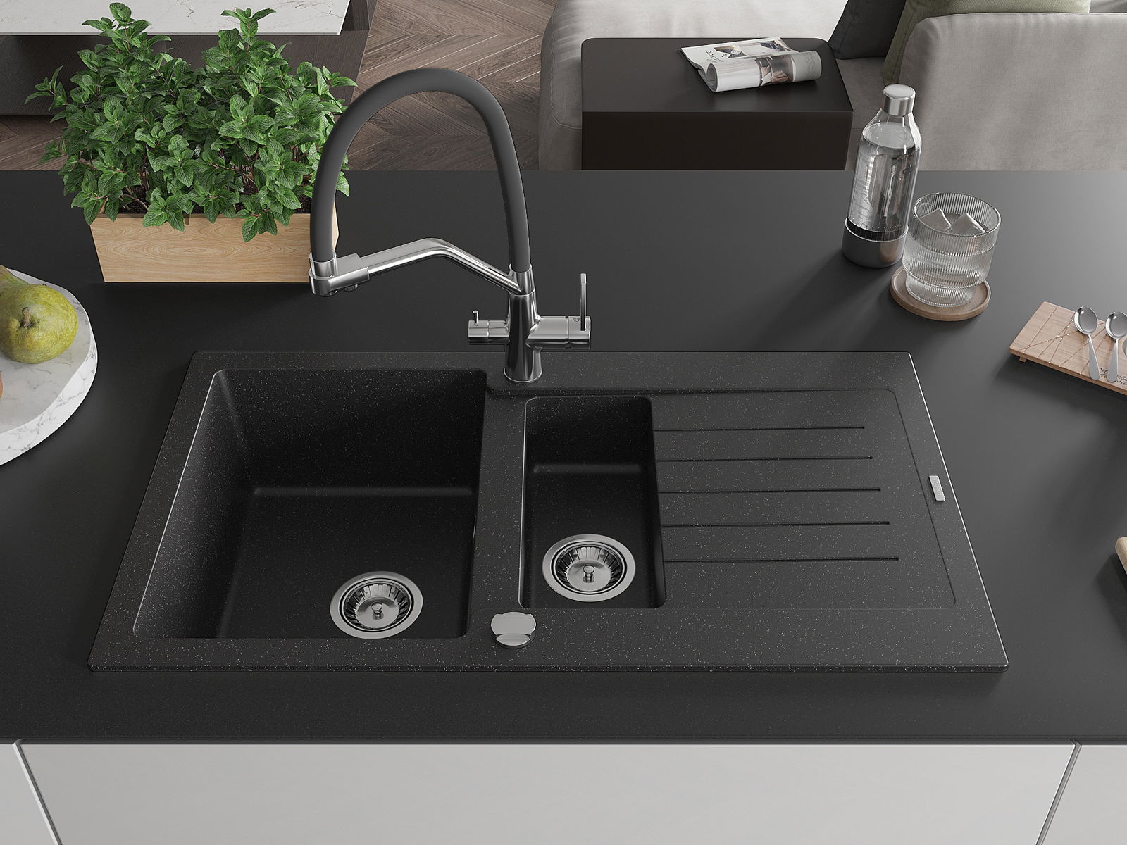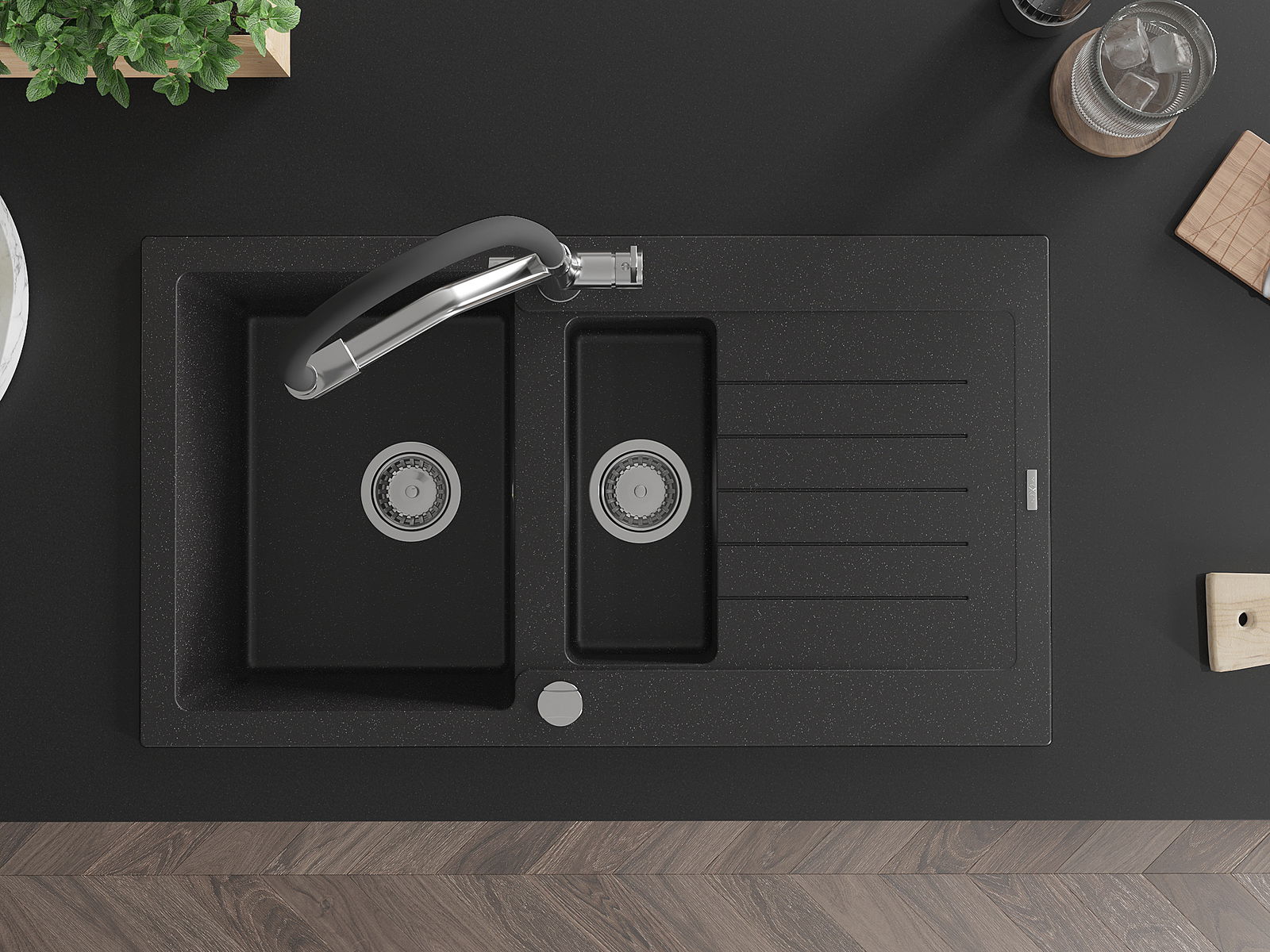 Mexen Matias évier en granit 1,5 cuves avec égouttoir et robinet de cuisine Duo, noir/métallique argenté - 6502-73-671701-07