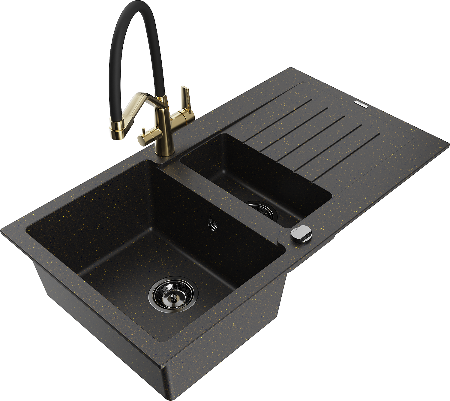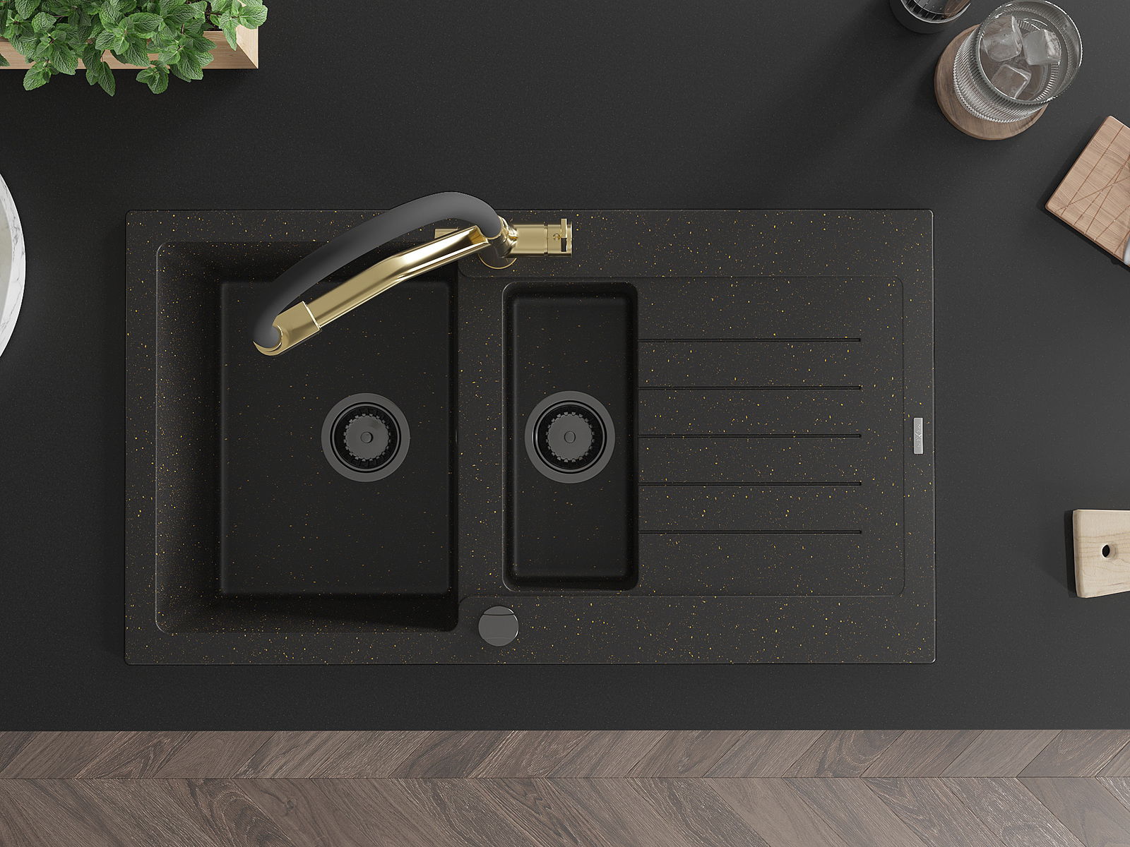 Mexen Matias évier en granit 1,5 bac avec égouttoir et robinet de cuisine Duo, noir/métallique doré - 6502-75-671701-57-B