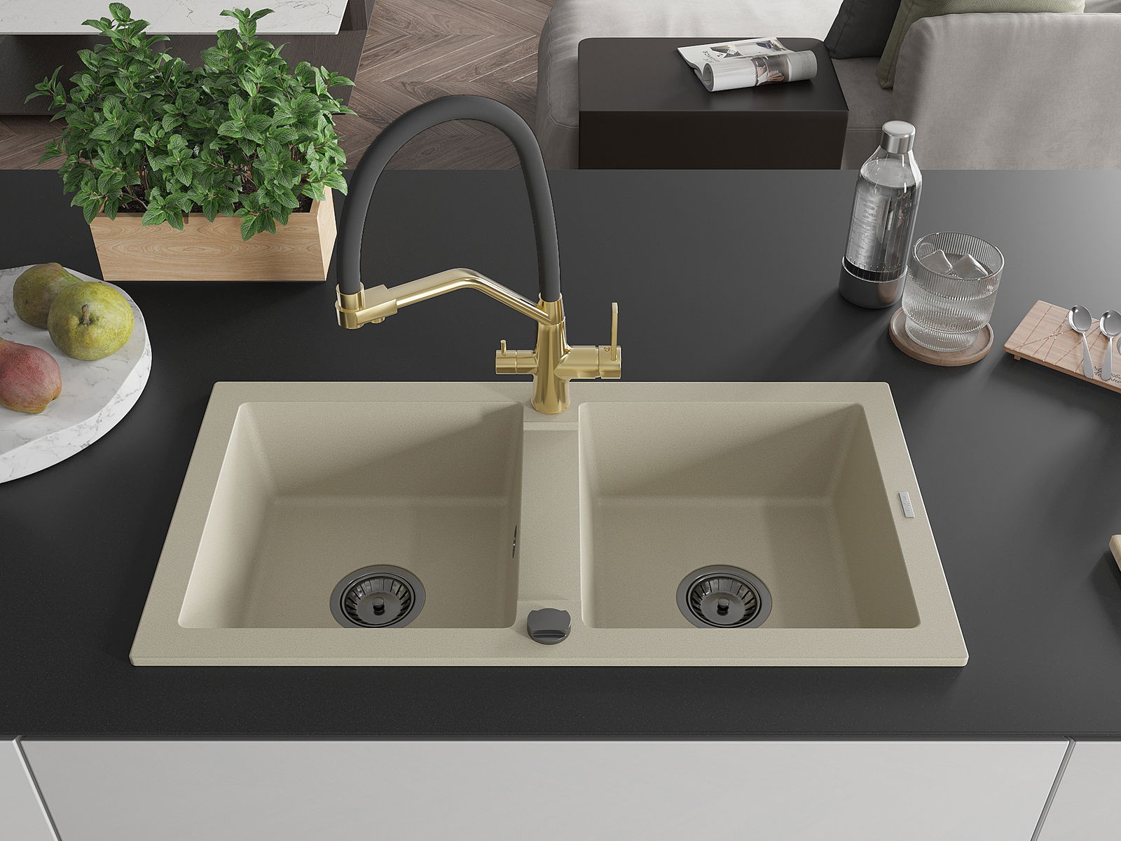 Mexen Mario évier en granit 2 bacs avec robinet de cuisine Duo, beige - 6504-69-671701-57-B