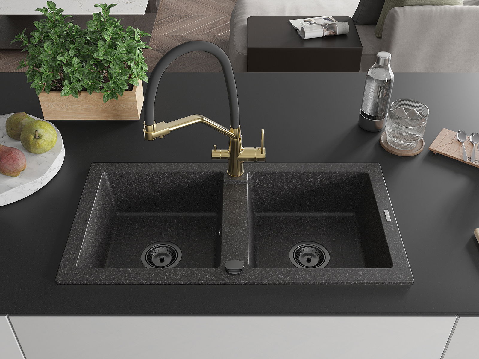 Mexen Mario évier en granit à 2 bacs avec robinet de cuisine Duo, noir moucheté - 6504-76-671701-57-B