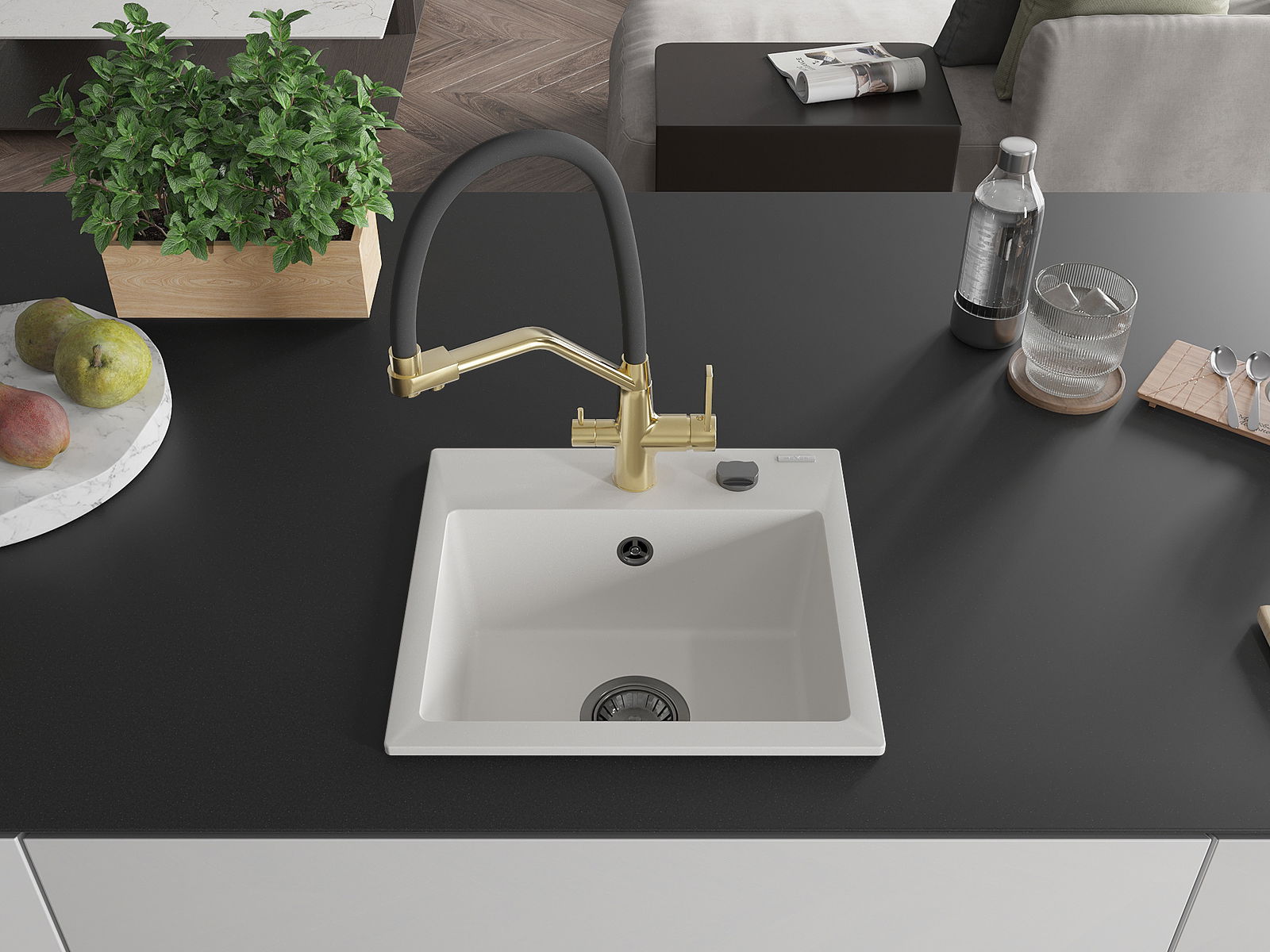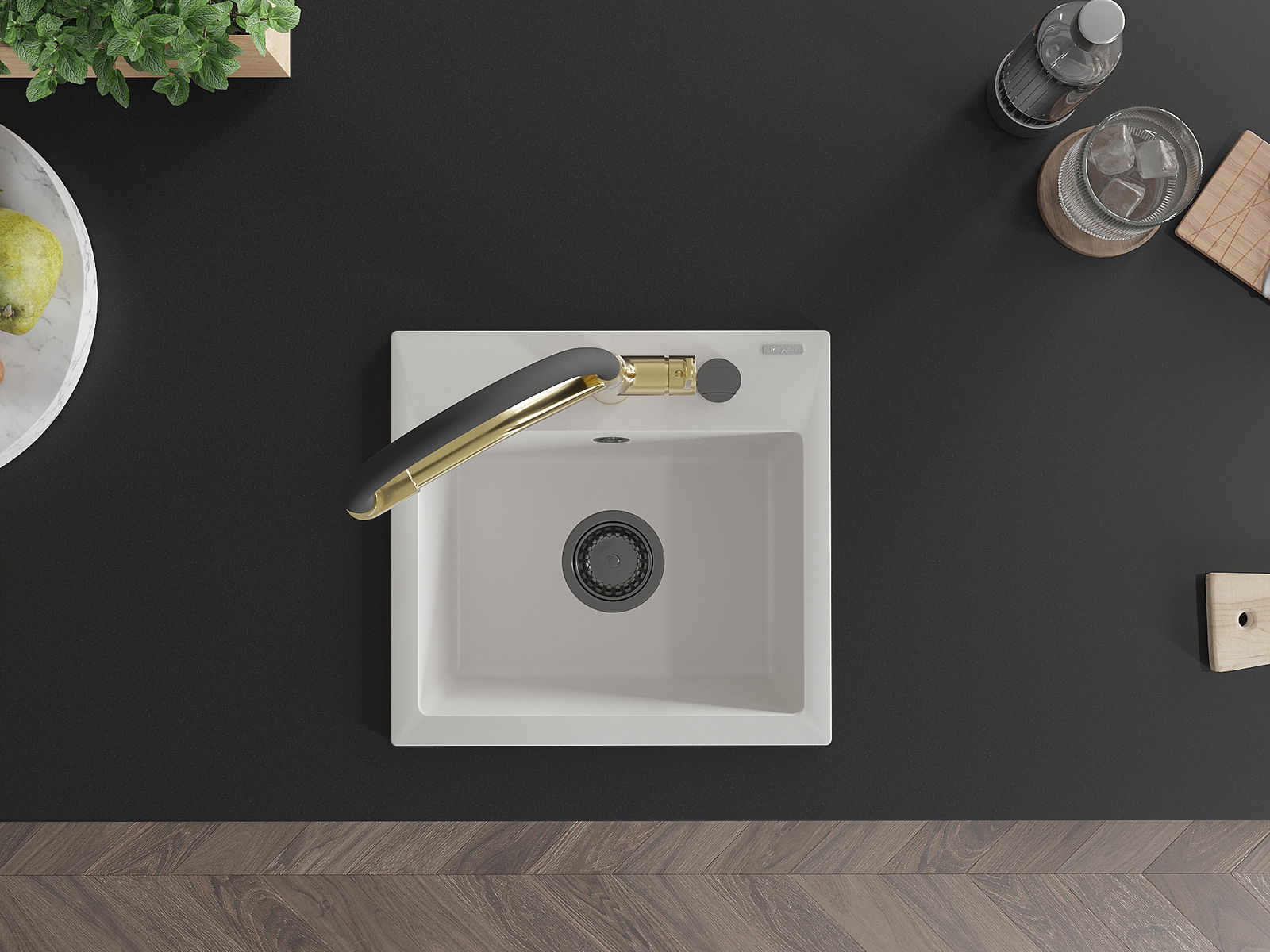 L'évier a un trou sous-meulé de 35 mm de diamètre à percer soi-même. Il peut être utilisé, entre autres, pour installer un distributeur de liquide, ce qui éliminera la présence de bouteilles en plastique dans la cuisine et lui donnera une finition élégante.