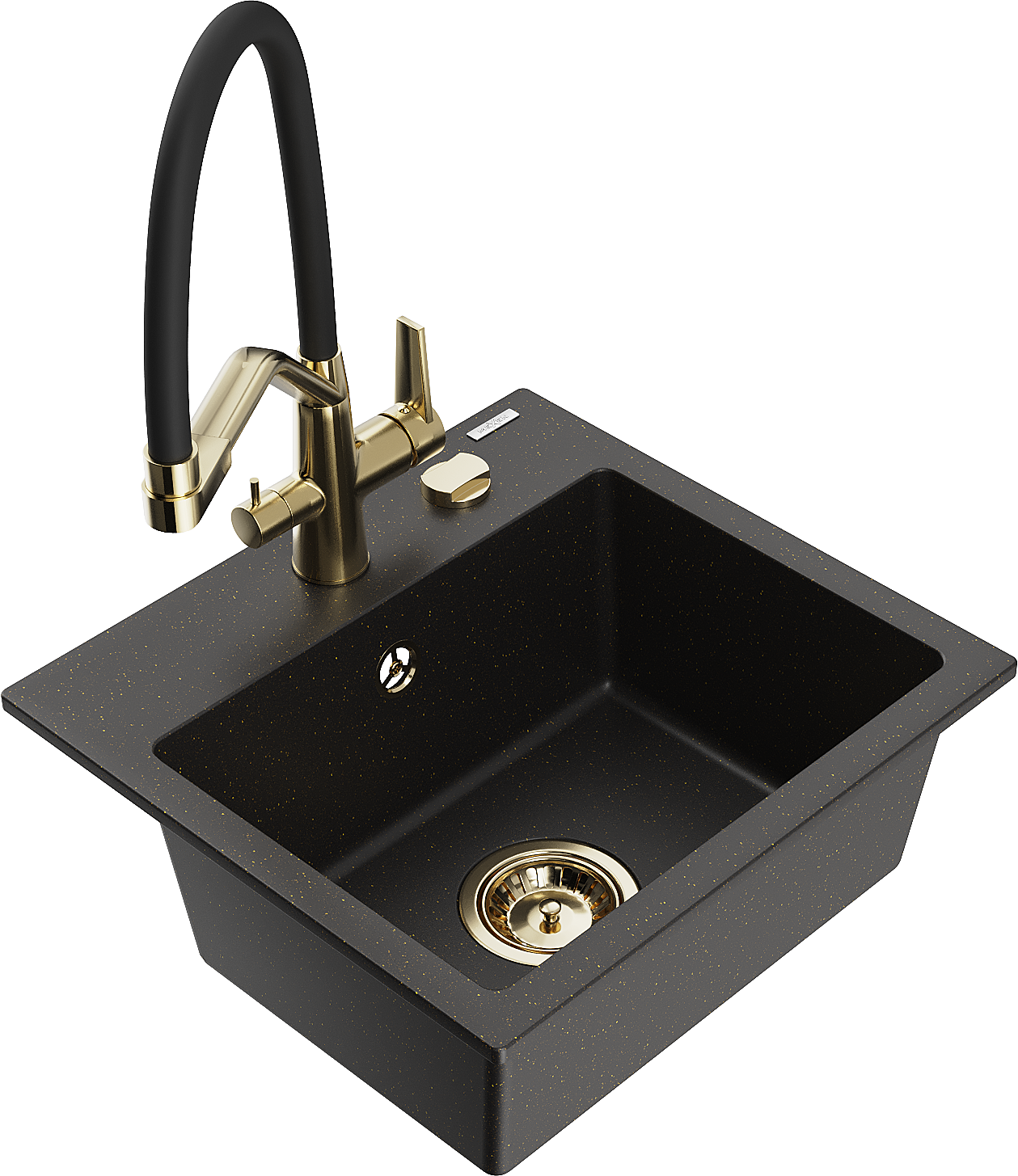Mexen Milo évier de cuisine en granit 1-bac avec robinet de cuisine Duo, noir/doré métallisé - 6505-75-671701-57-G