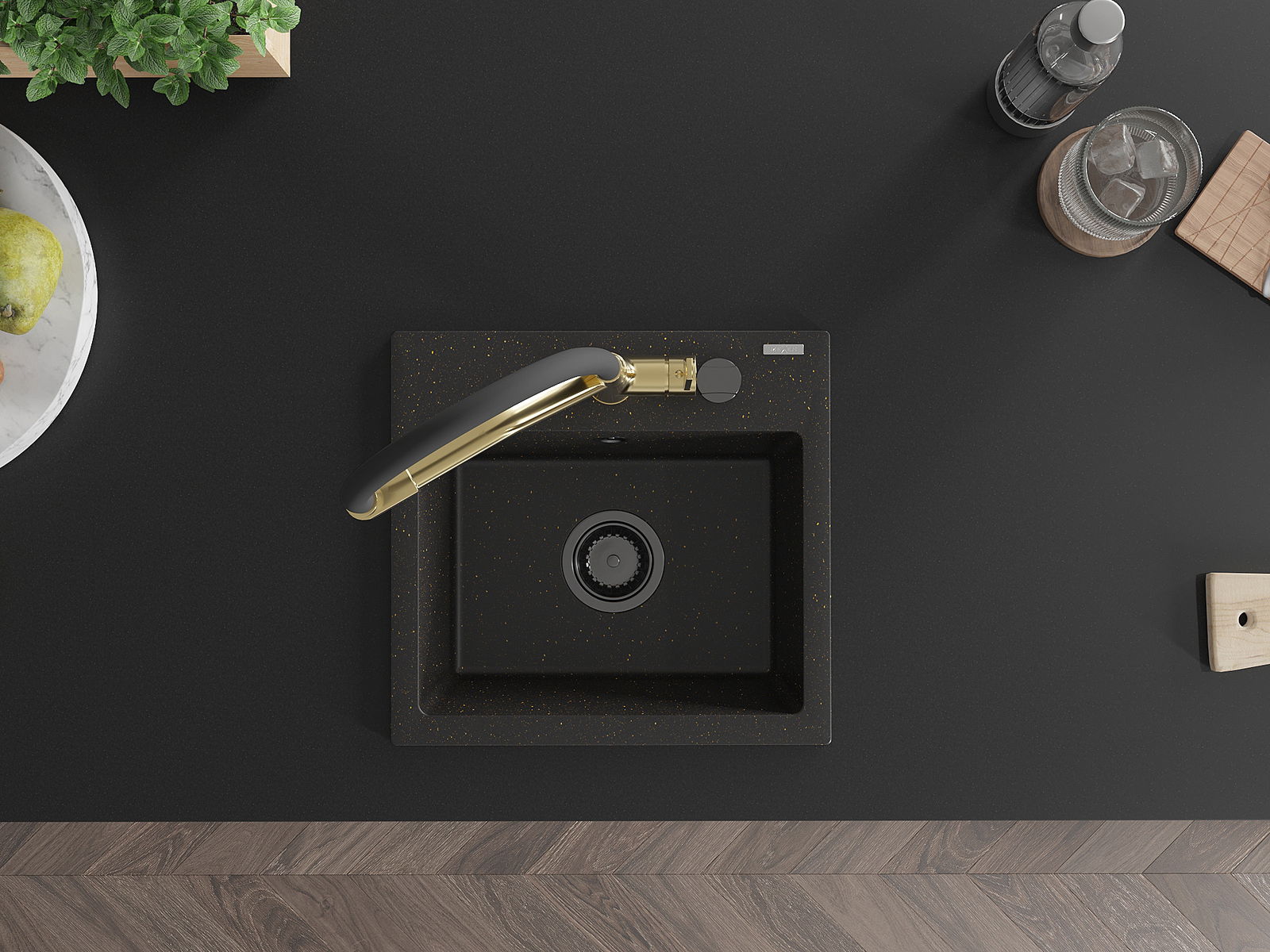 Mexen Milo évier en granit 1 bac avec robinet de cuisine Duo, noir/or métallique - 6505-75-671701-57-B