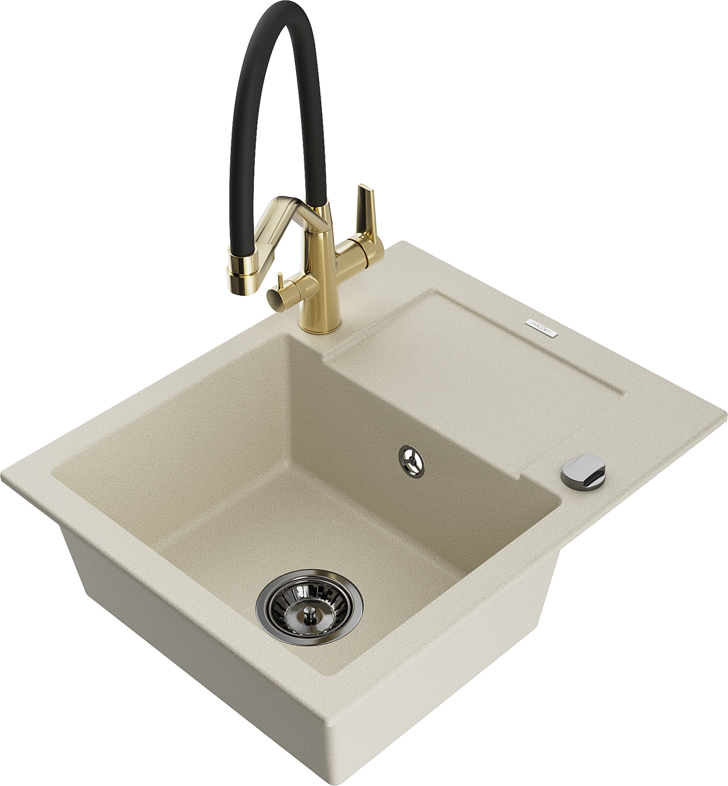 Mexen Enzo évier en granit à 1 bac avec égouttoir et robinet de cuisine Duo, beige - 6506-69-671701-57-B