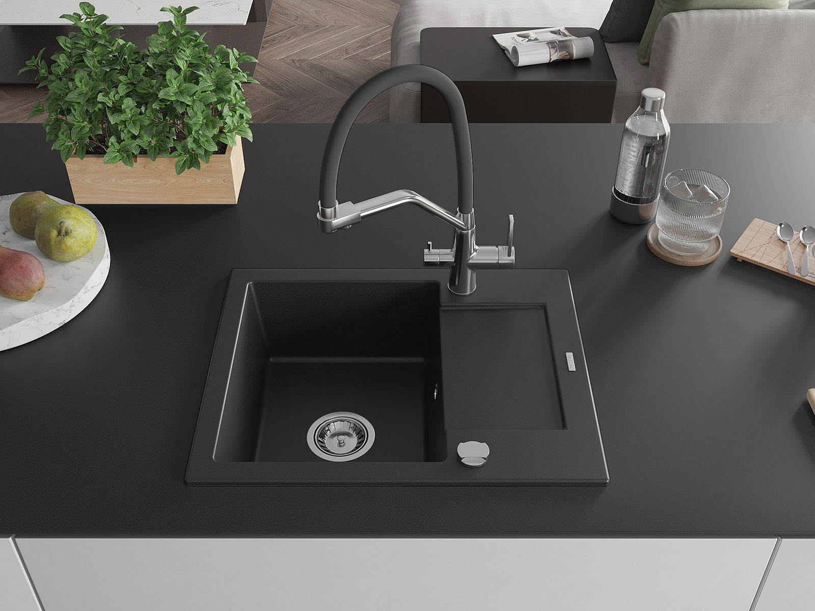Mexen Enzo évier en granit à 1 bac avec égouttoir et robinet de cuisine Duo, noir - 6506-77-671701-07