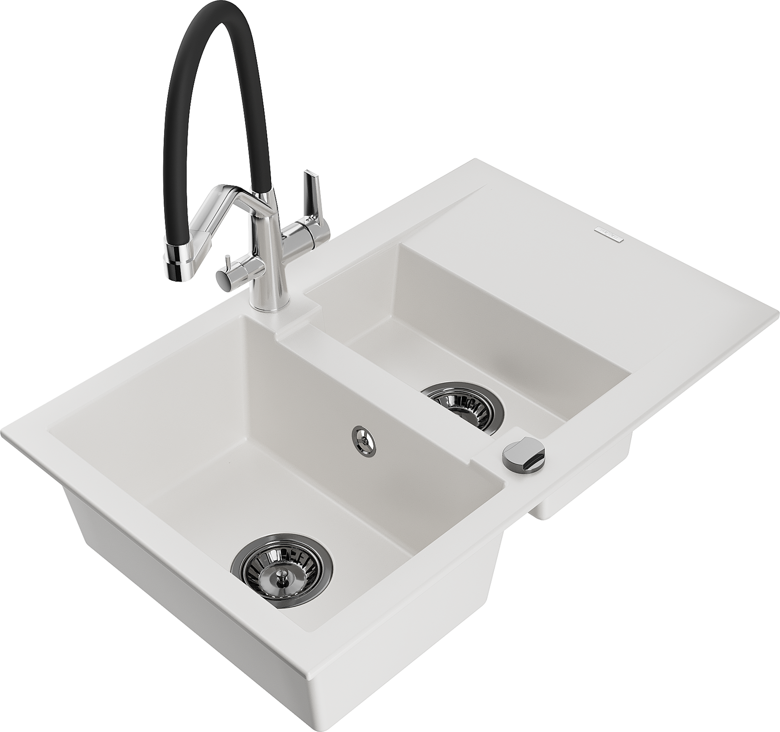 Mexen Gaspar évier en granit 1,5 bac avec égouttoir et robinet de cuisine Duo, blanc - 6507-20-671701-07-B