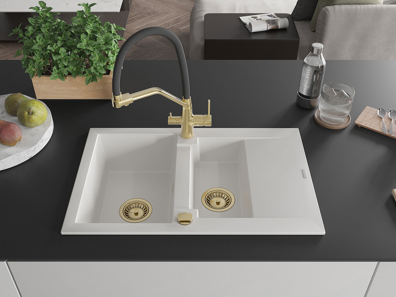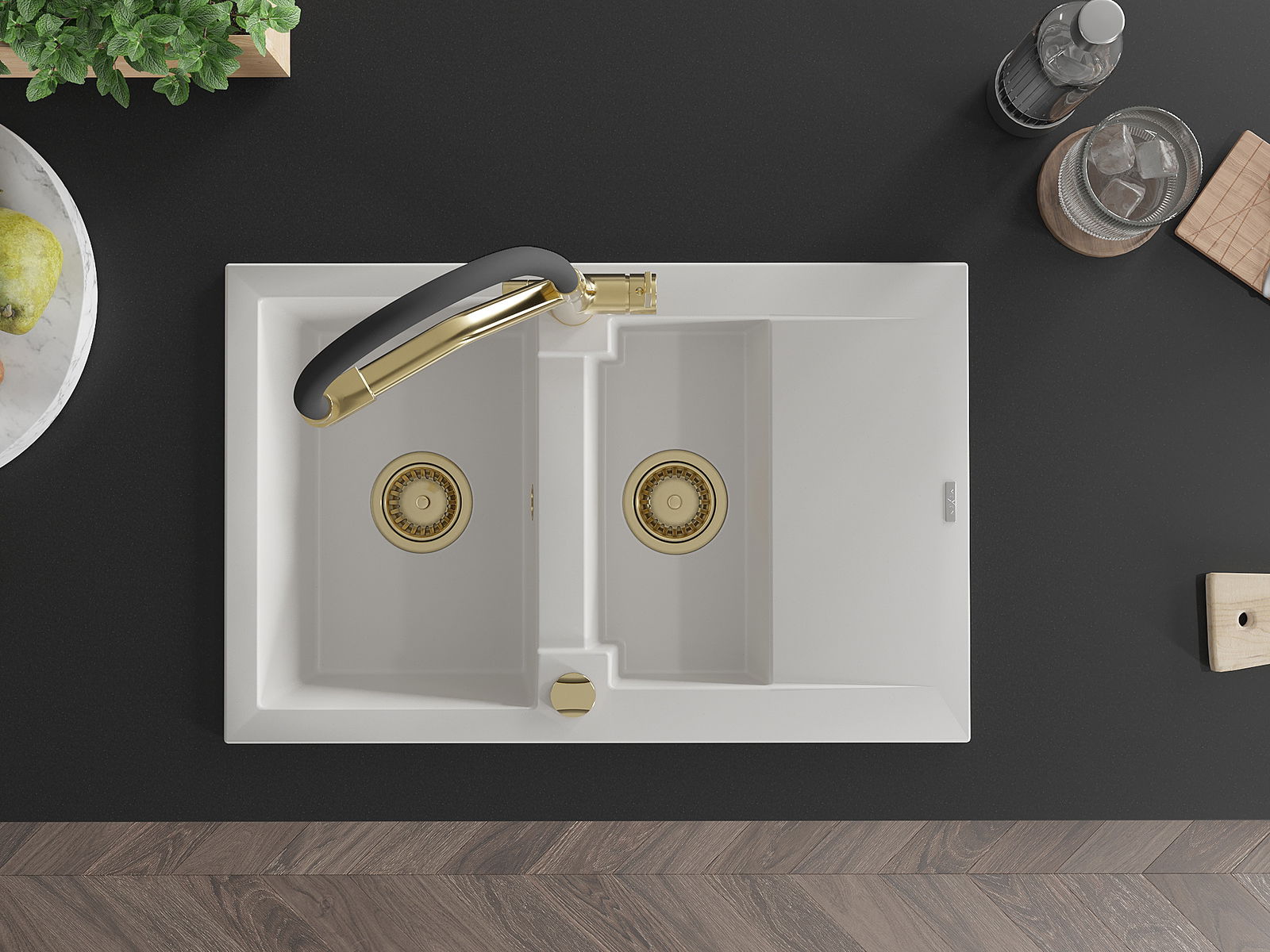 Mexen Gaspar évier en granit 1,5 bacs avec égouttoir et robinet de cuisine Duo, blanc - 6507-20-671701-57-G