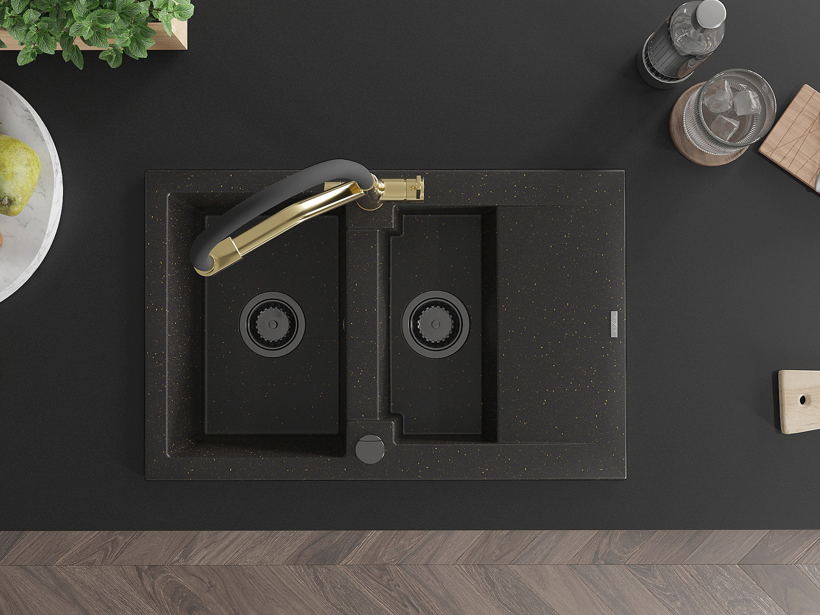 Mexen Gaspar évier en granit 1,5 bac avec égouttoir et mitigeur de cuisine Duo, noir/or métallique - 6507-75-671701-57-B