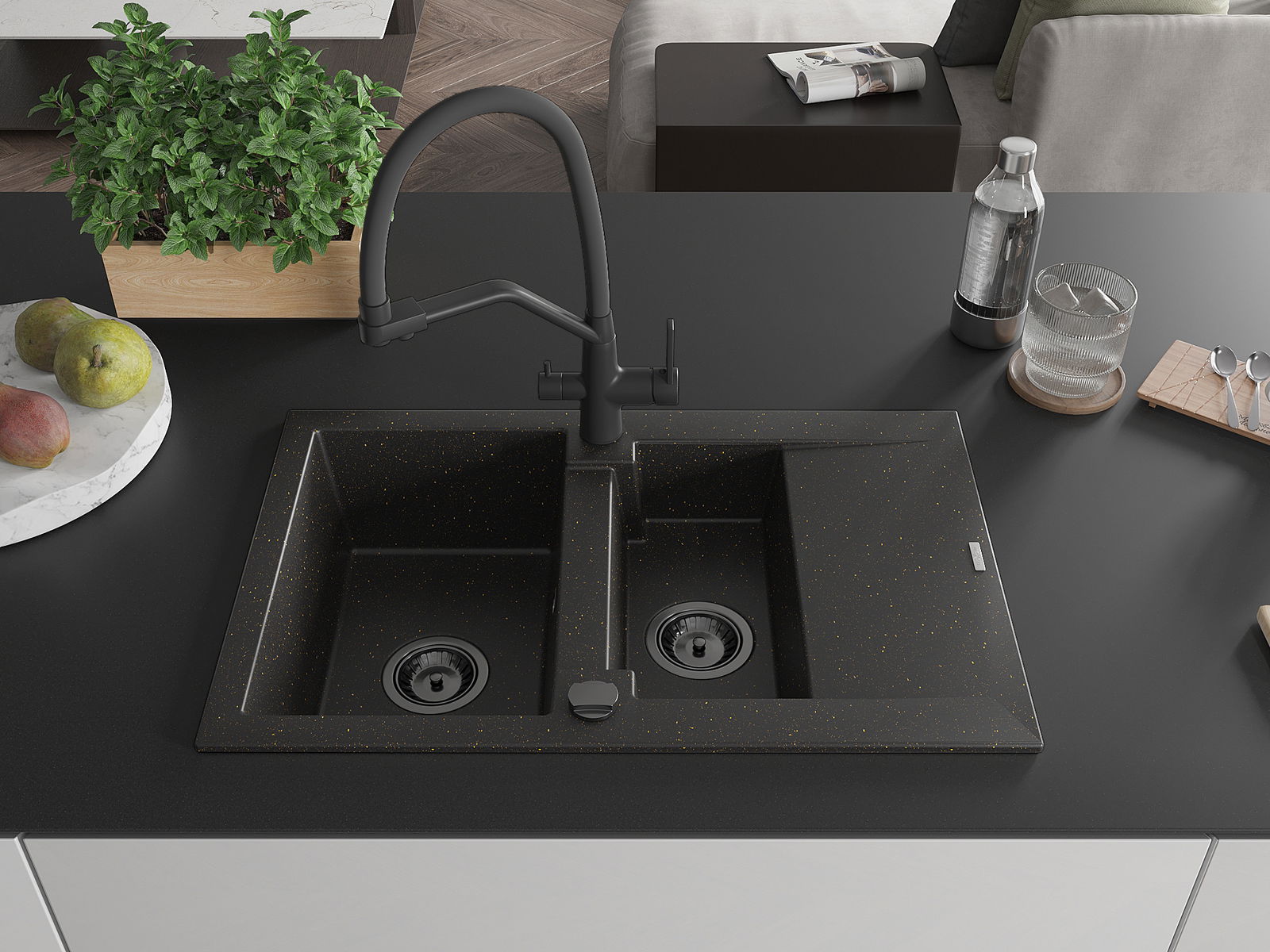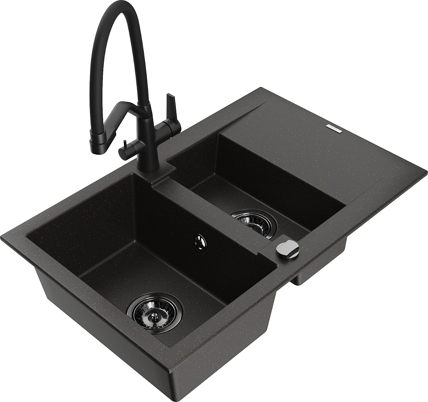 Mexen Gaspar évier en granit 1,5 bac avec égouttoir et mitigeur de cuisine Duo, noir/or métallique - 6507-75-671701-70-B