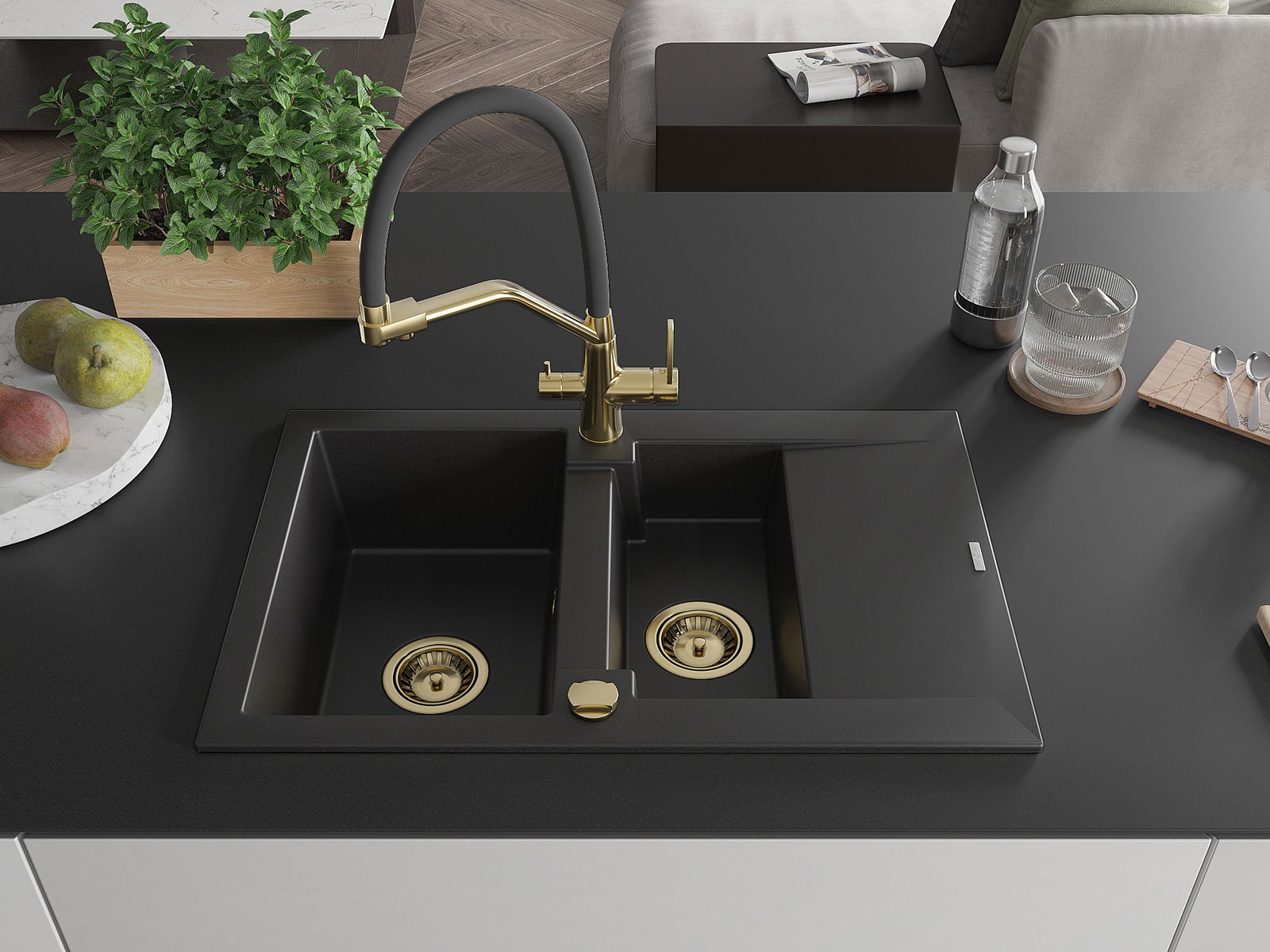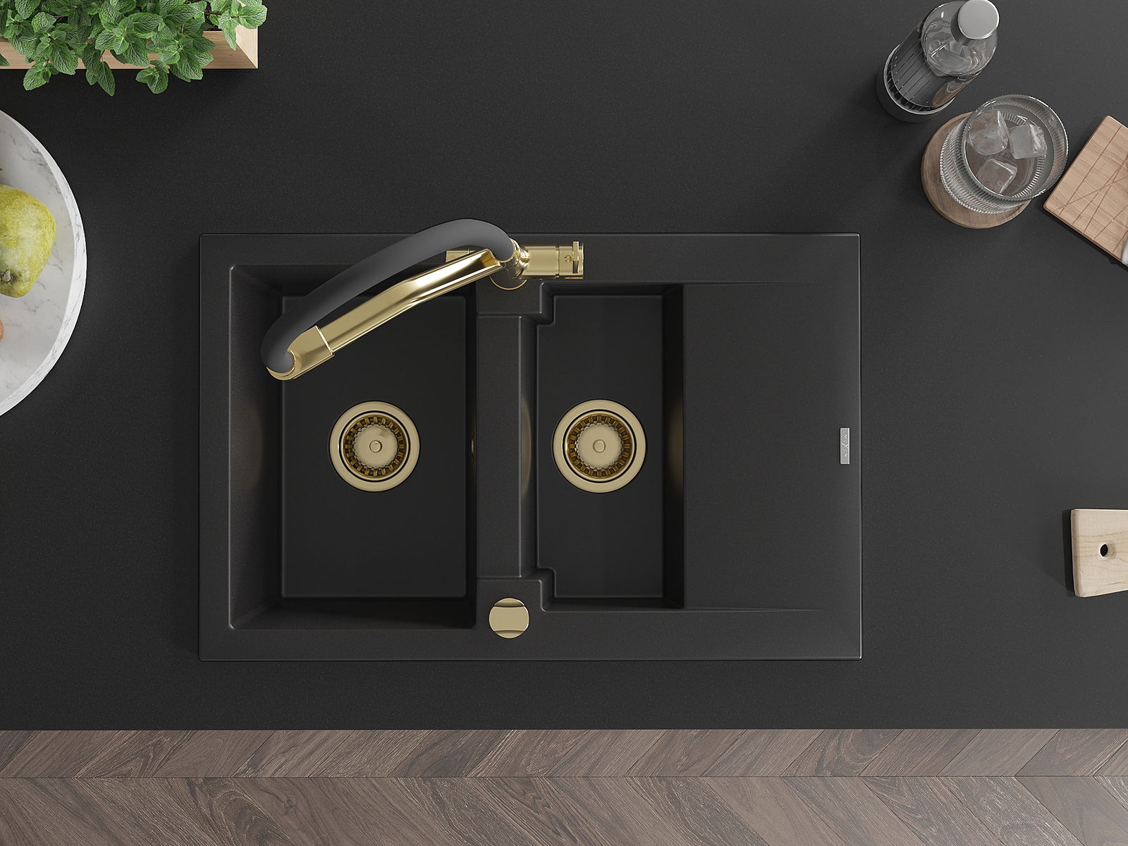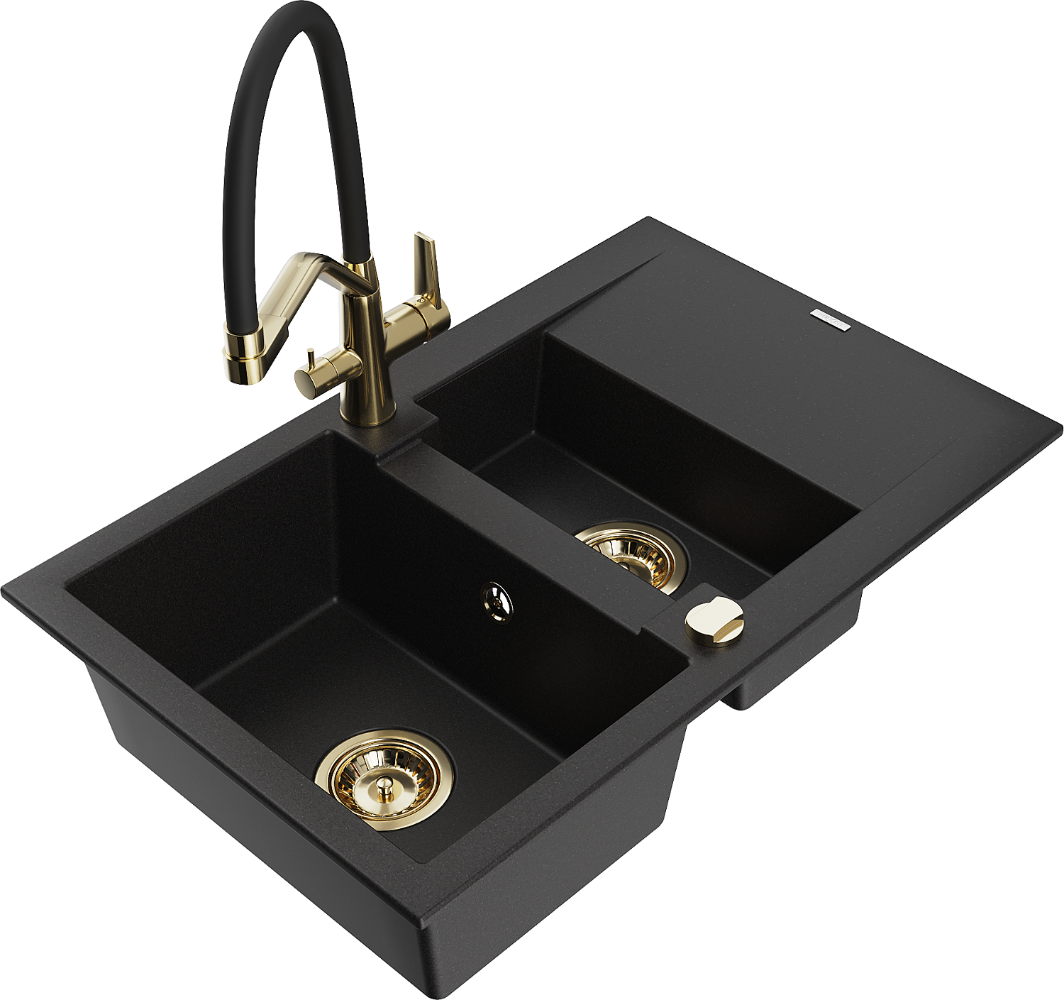 Mexen Gaspar évier en granit 1,5 bac avec égouttoir et robinet de cuisine Duo, noir - 6507-77-671701-57-G