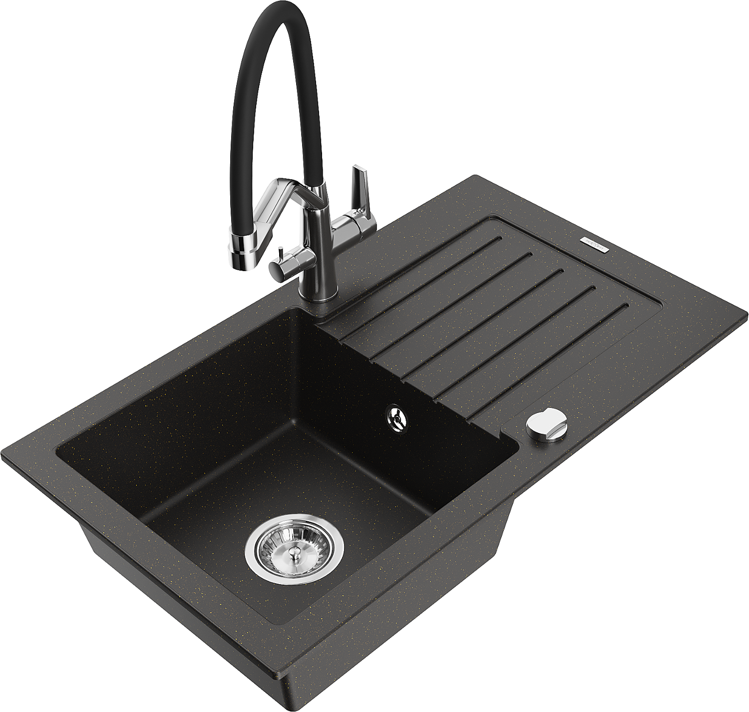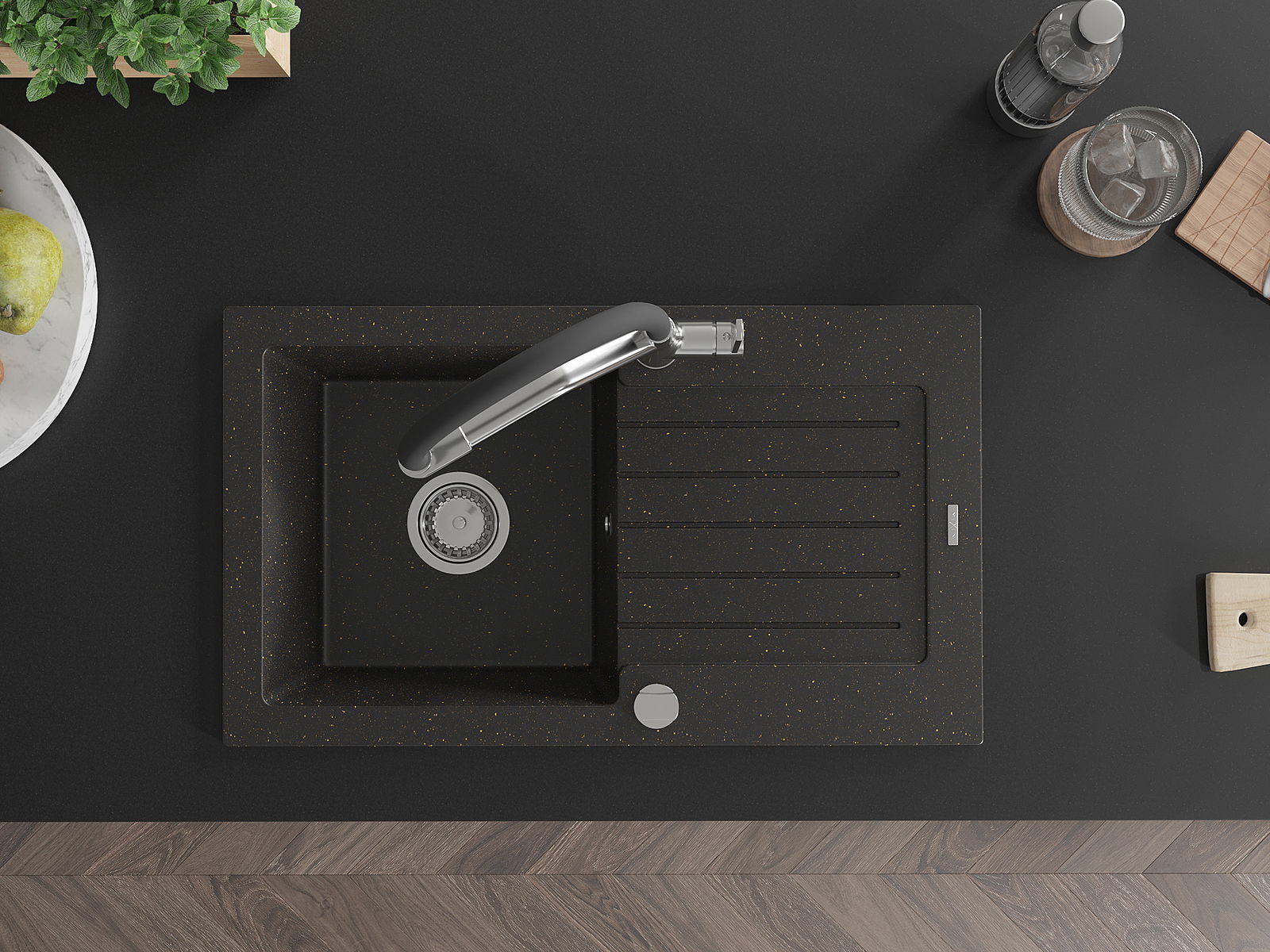 Mexen Pablo évier de cuisine en granit 1 bac avec égouttoir et robinet de cuisine Duo, noir/or métallique - 6510-75-671701-07