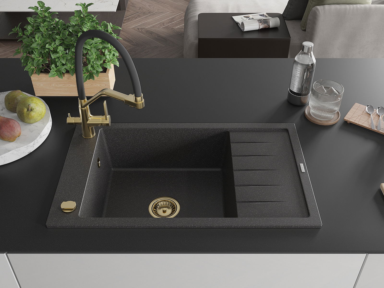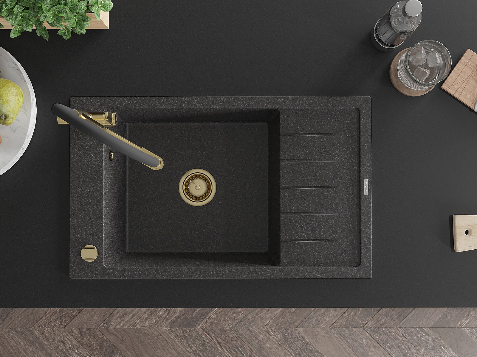 L'évier a un trou sous-meulé de 35 mm de diamètre à percer soi-même. Il peut être utilisé, entre autres, pour installer un distributeur de liquide, ce qui éliminera la présence de bouteilles en plastique dans la cuisine et lui donnera une finition élégante.