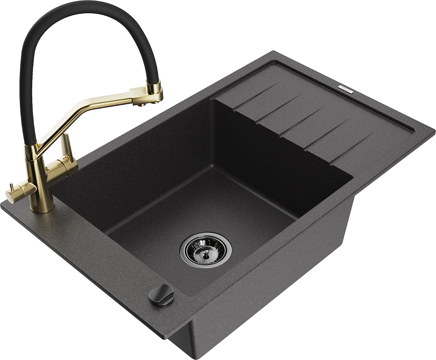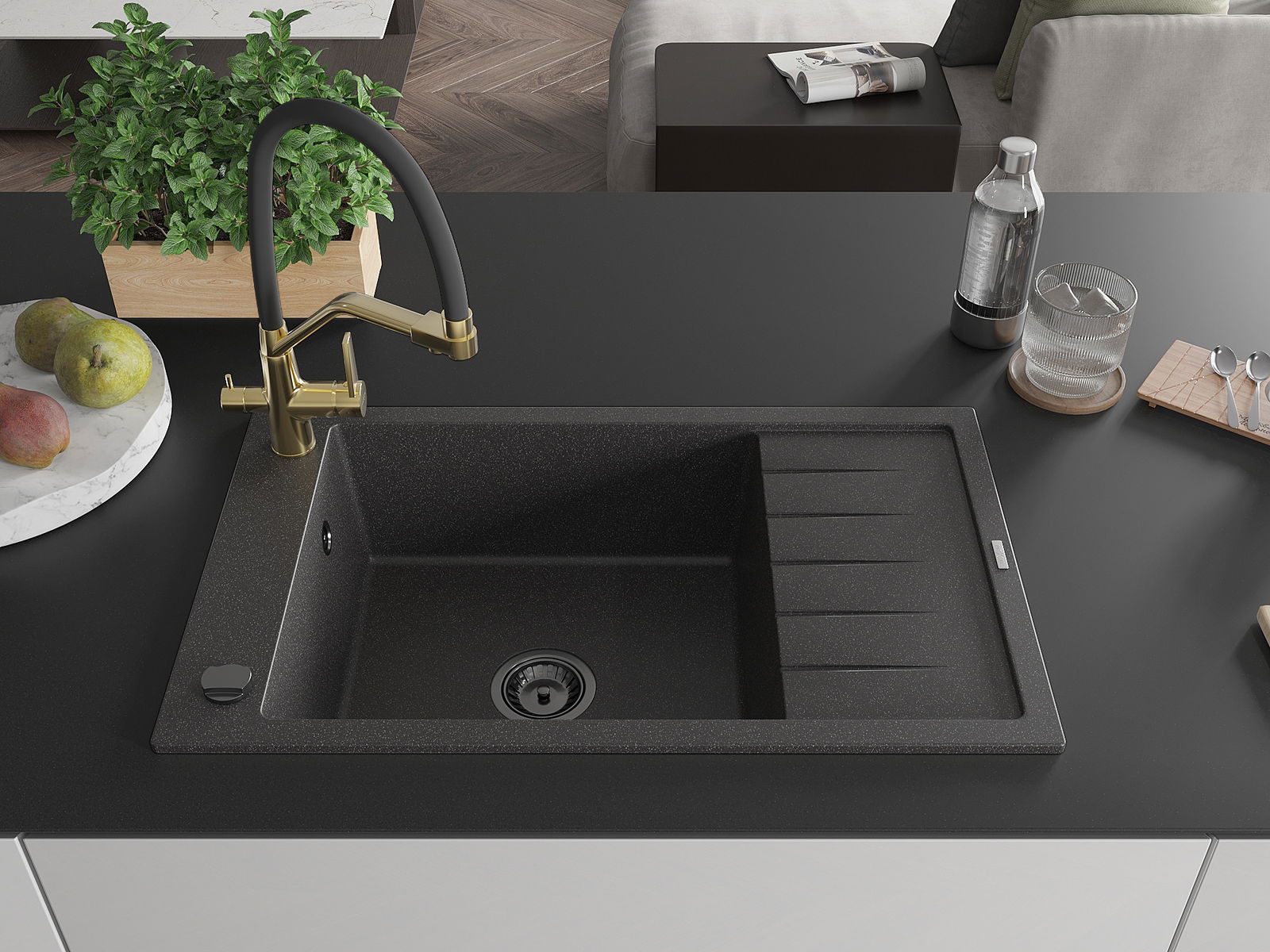 Mexen Elias évier en granit 1 bac avec égouttoir et mitigeur cuisine Duo, noir moucheté - 6511-76-671701-57-B