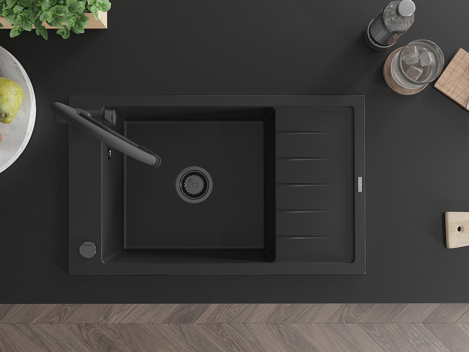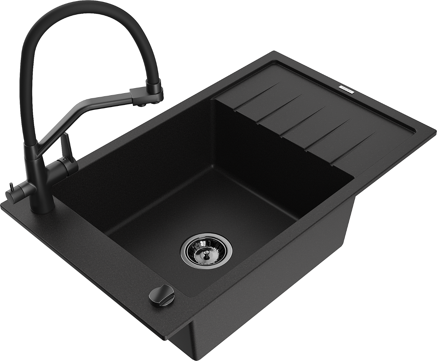 Mexen Elias évier de cuisine granit 1 bac avec égouttoir et robinet Duo, noir - 6511-77-671701-70-B