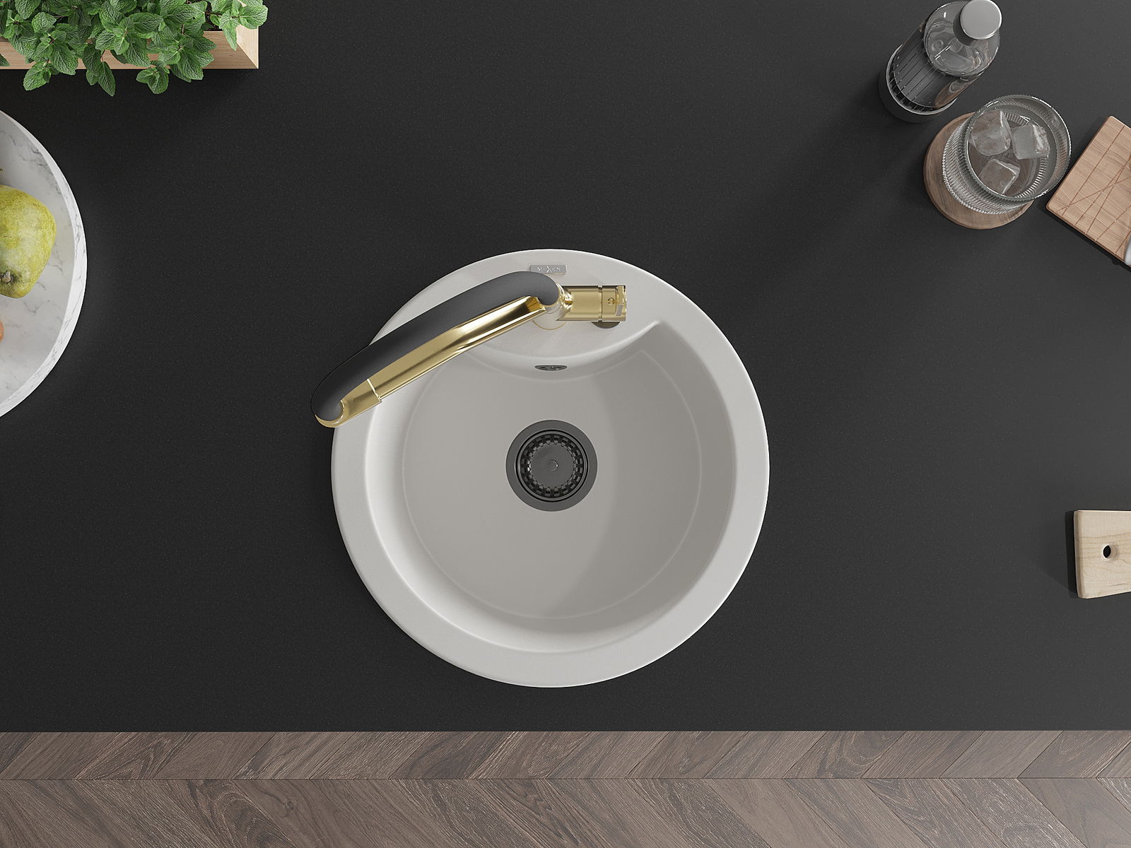 L'évier a un trou sous-meulé de 35 mm de diamètre à percer soi-même. Il peut être utilisé, entre autres, pour installer un distributeur de liquide, ce qui éliminera la présence de bouteilles en plastique dans la cuisine et lui donnera une finition élégante.