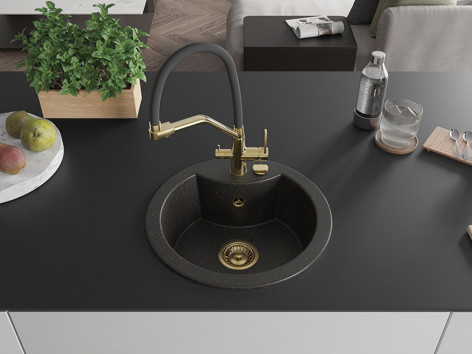 Mexen Diego évier de cuisine en granit 1 bac avec robinet de cuisine Duo, noir/or métallique - 6512-75-671701-57-G