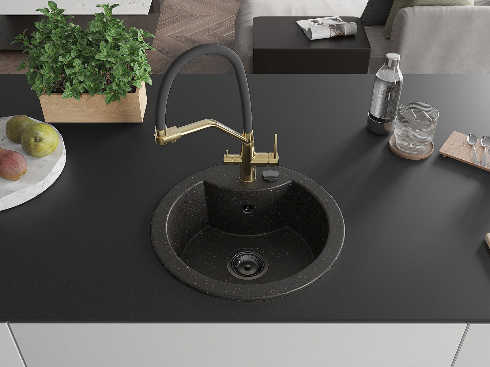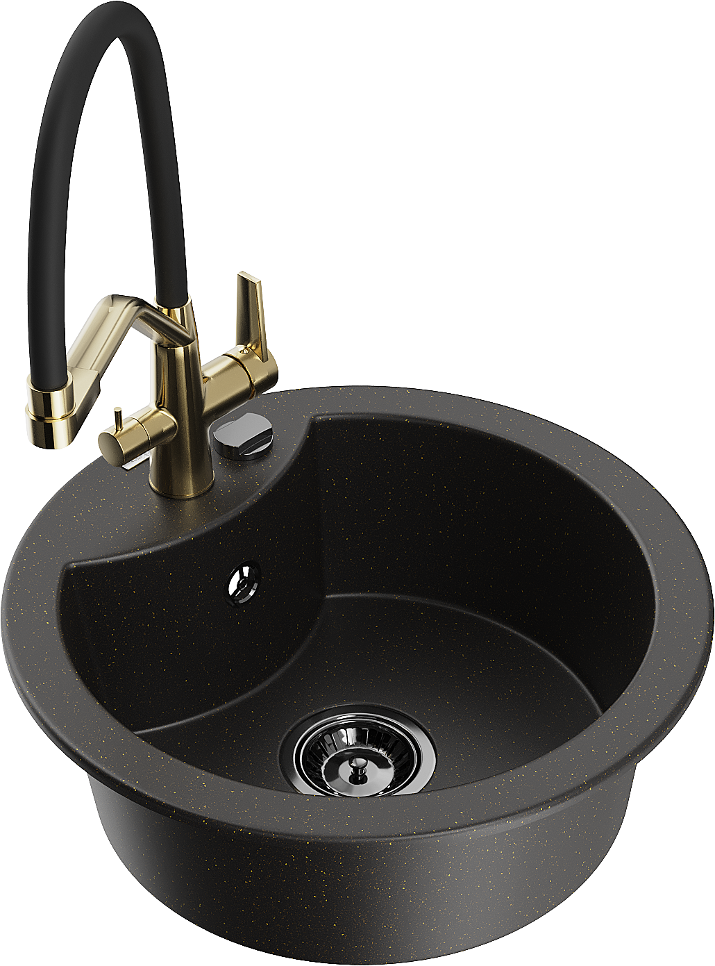 Mexen Diego évier en granit 1 bac avec robinet de cuisine Duo, noir/or métallique - 6512-75-671701-57-B