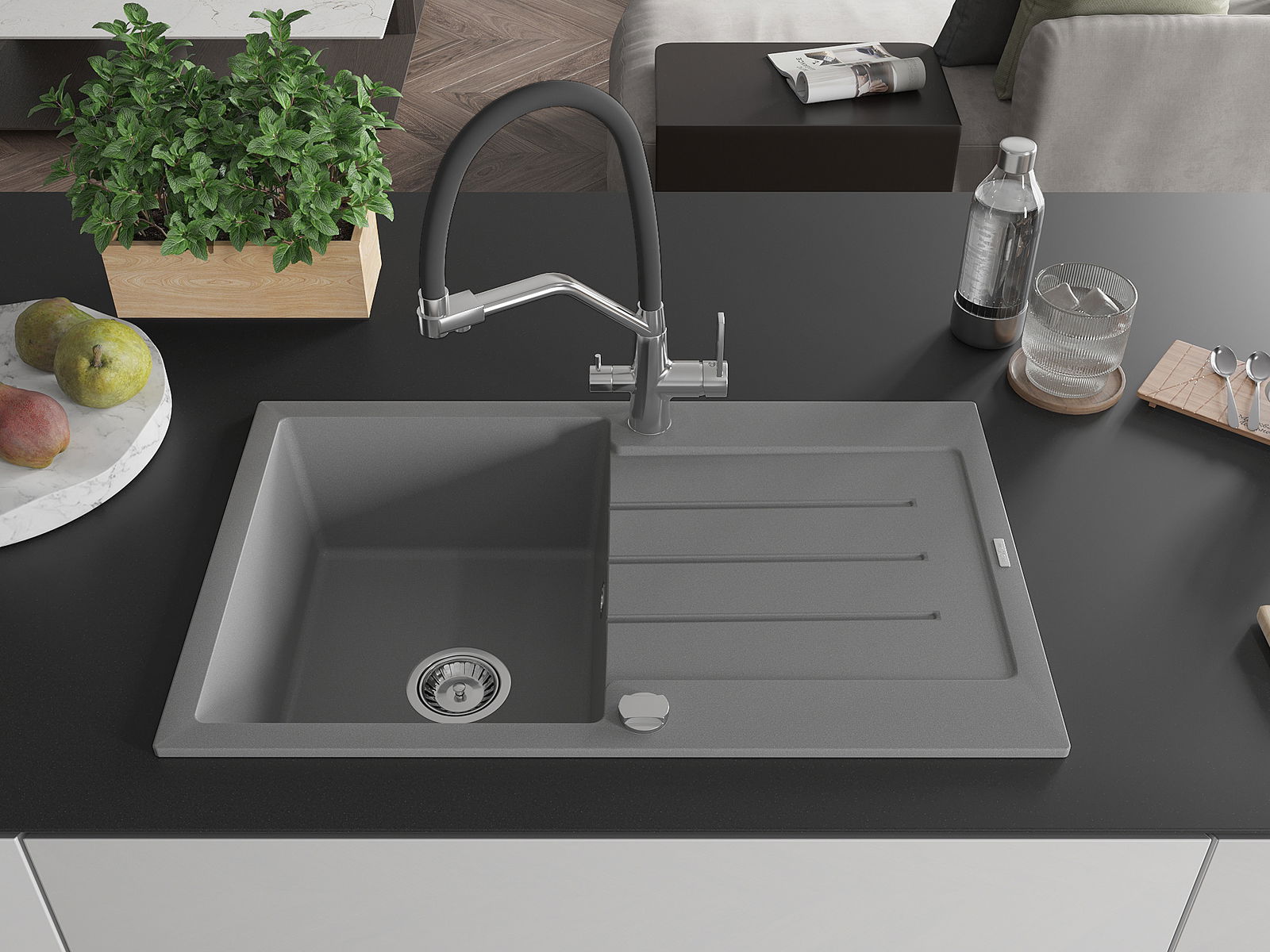 Mexen Bruno évier de cuisine en granit 1 bac avec égouttoir et robinet Duo, gris - 6513-71-671701-07