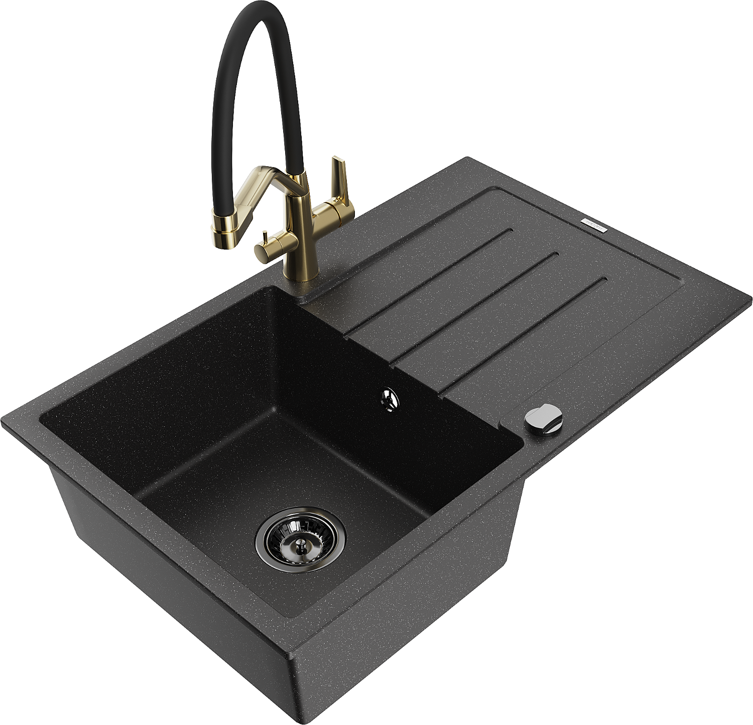 Mexen Bruno évier en granit 1 bac avec égouttoir et robinet de cuisine Duo, noir/métallisé argent - 6513-73-671701-57-B