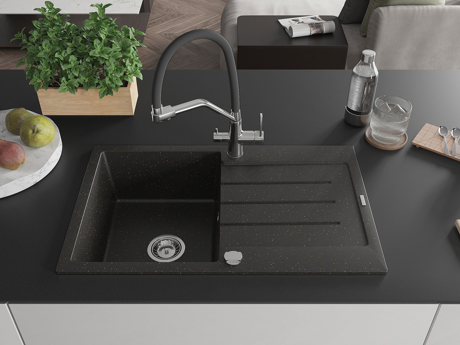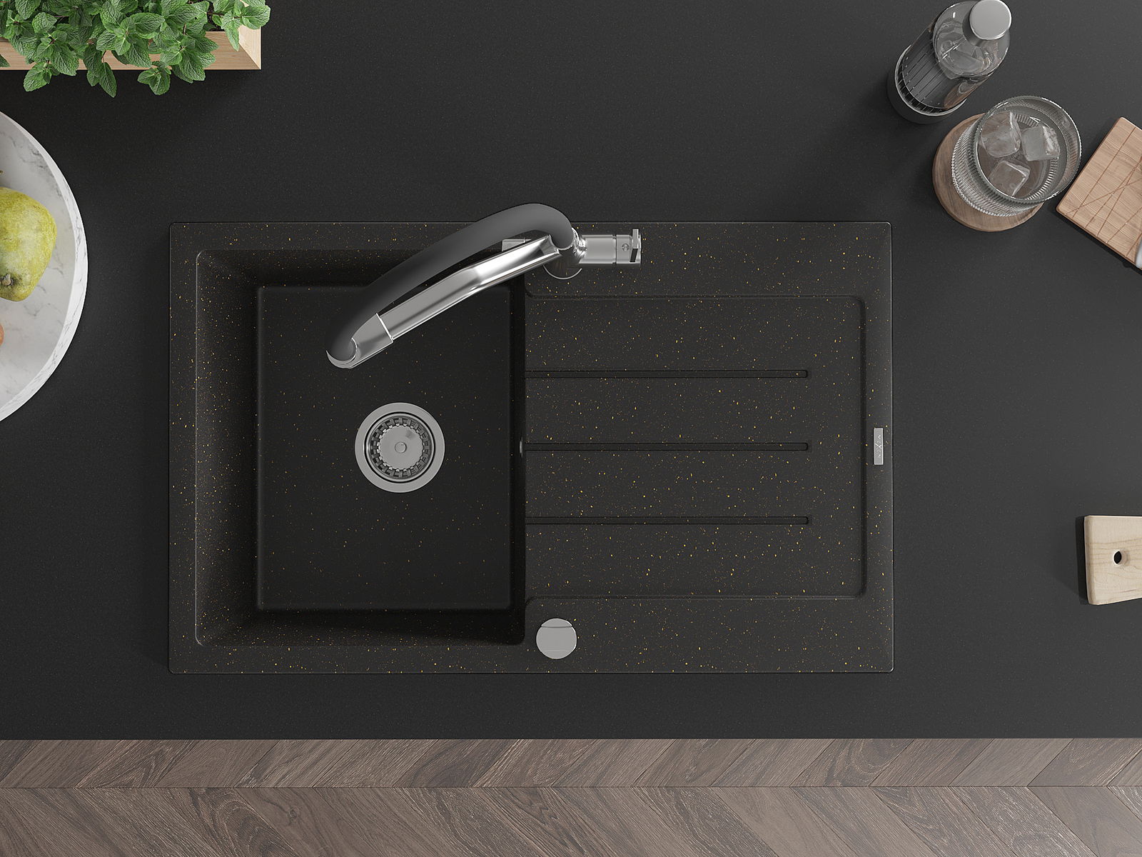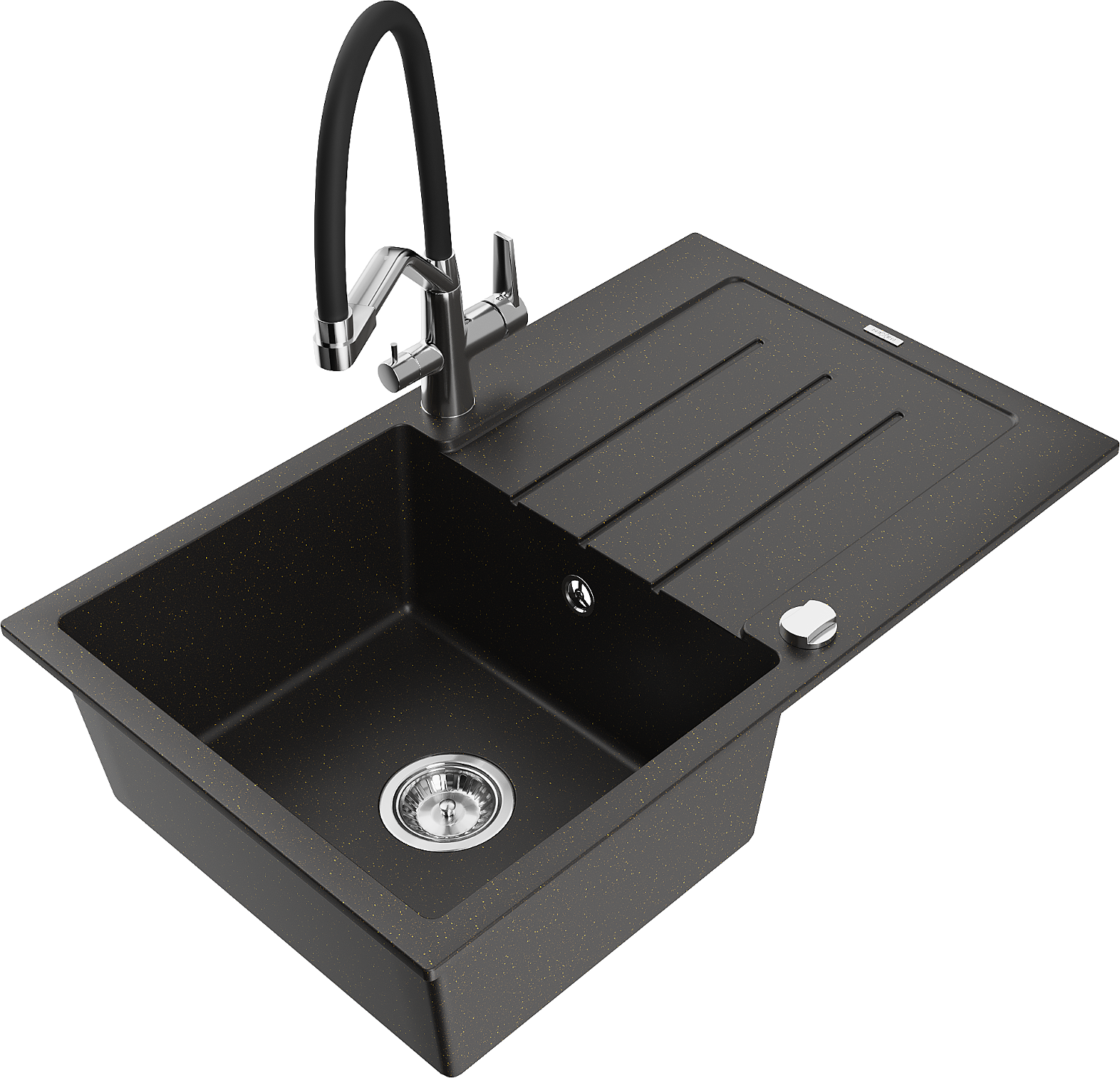 Mexen Bruno évier en granit 1 bac avec égouttoir et robinet de cuisine Duo, noir/or métallique - 6513-75-671701-07