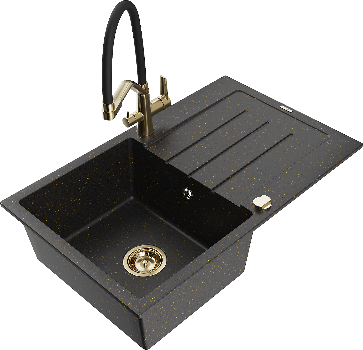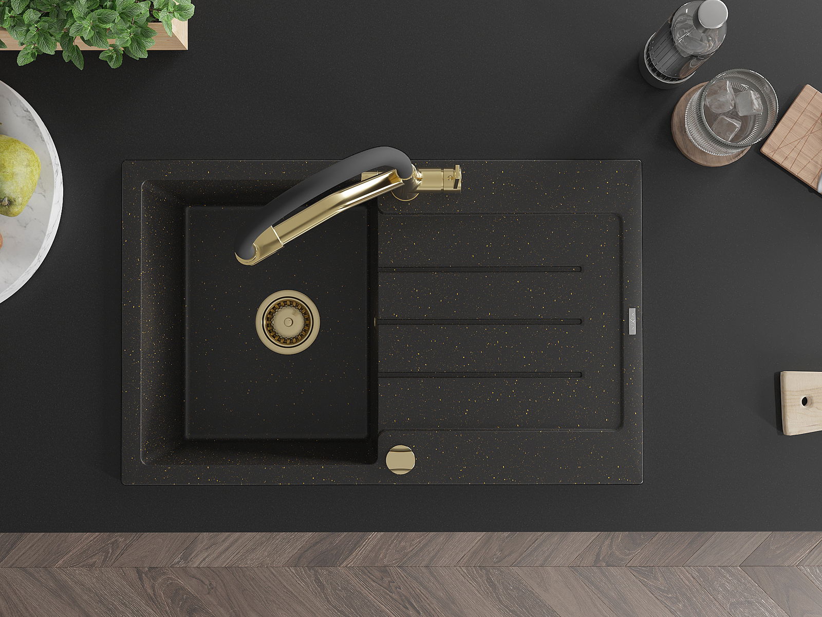 Mexen Bruno évier en granit 1 bac avec égouttoir et robinet de cuisine Duo, noir/doré métallique - 6513-75-671701-57-G
